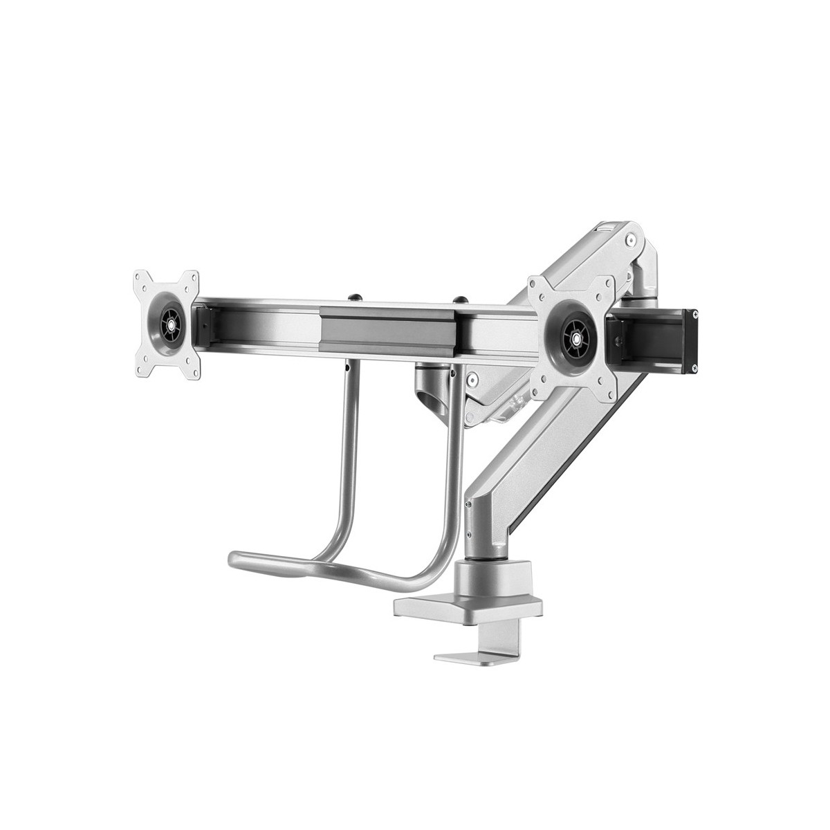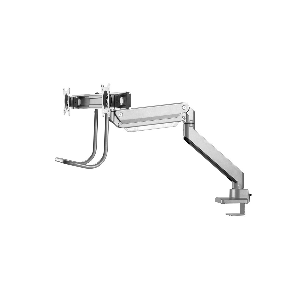 Questo braccio porta monitor NewStar, modello NM-D775DXSILVER consente di collegare due schermi LCD/LED/TFT su di una scrivania con la modalità di fissaggio su piano attraverso un morsetto o vite centrale (entrambe sono incluse).
