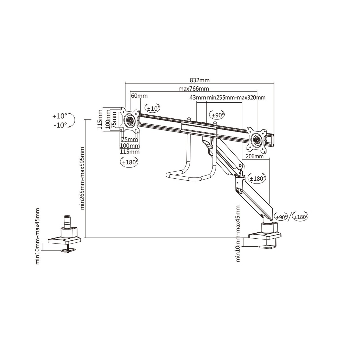 Utilizzate un braccio porta monitor per sfruttare pienamente le capacità del vostro schermo. Il braccio è facile da regolare in altezza e profondità. È inoltre possibile inclinare lo schermo in senso verticale, orizzontale e farlo ruotare; questo crea la posizione ergonomica di lavoro ideale riducendo il rischio di mal di schiena e al collo. I cavi possono essere collocati sulla parte inferiore del braccio.