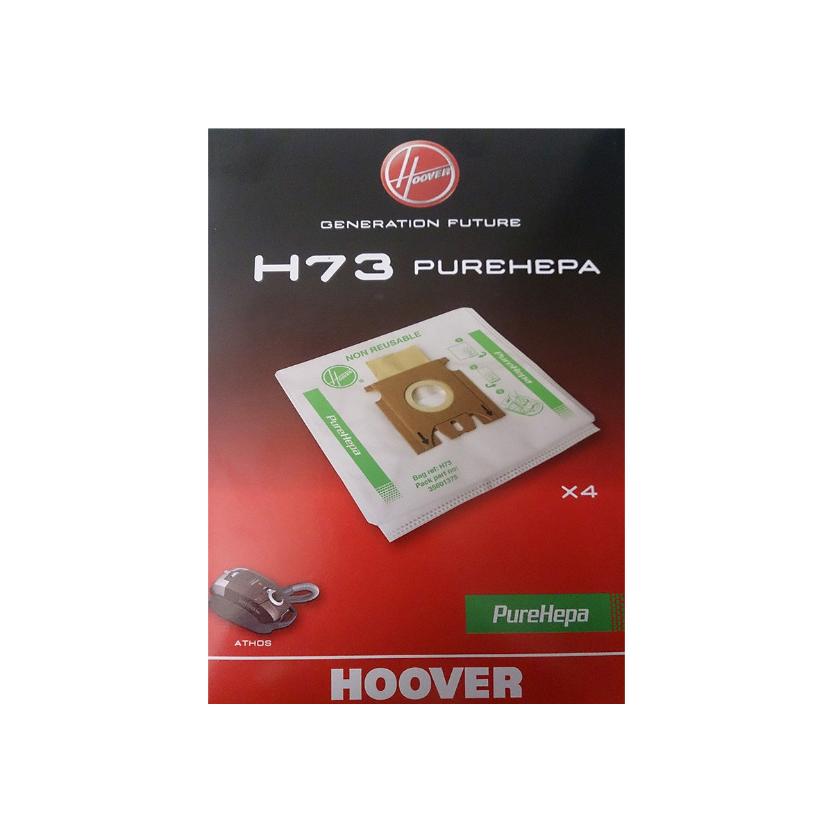Hoover H73. Colore del prodotto: Bianco, Compatibilità: Hoover Athos. Tipo di imballo: Scatola. Numero di sacchi per la polvere: 4 pezzo(i)