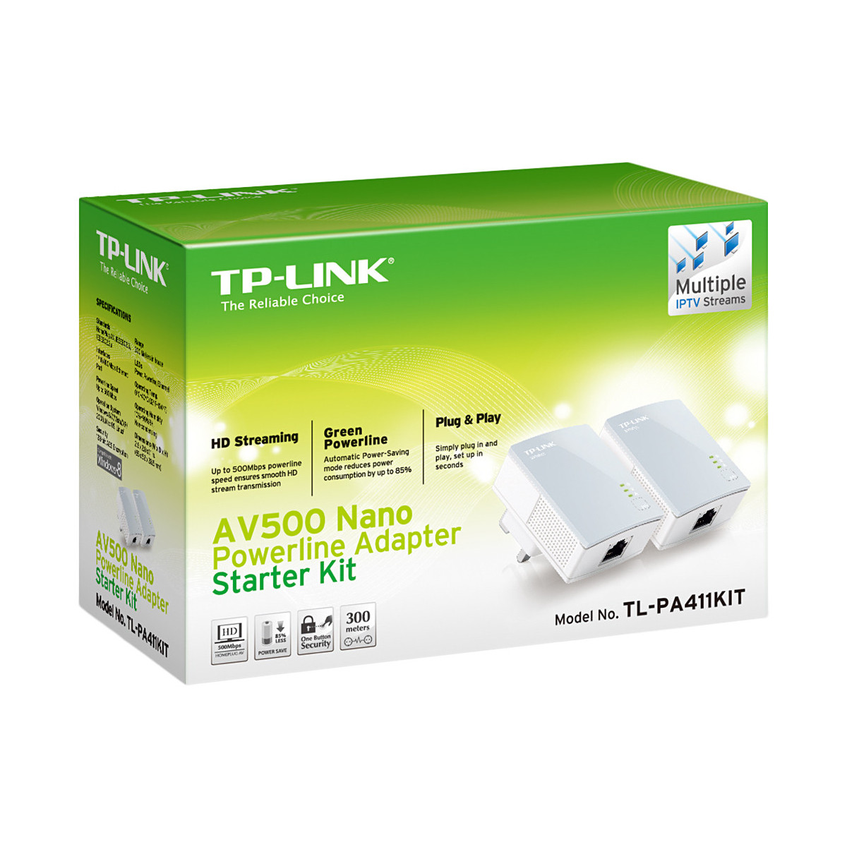 TP-LINK PA411KIT. Velocità massima di trasferimento dati: 500 Mbit/s, Standard di rete: IEEE 802.3,IEEE 802.3u, Tipo di interfaccia LAN Ethernet: Fast Ethernet. Consumi: 2 W. Colore del prodotto: Bianco, Indicatori LED: LAN, PLC, Potenza, Certificazione: FCC. Sistema operativo Windows supportato: Windows 2000,Windows 2000 Professional,Windows 7 Home Basic,Windows 7 Home Basic x64,Windows 7.... Larghezza: 65 mm, Profondità: 52 mm, Altezza: 28,5 mm