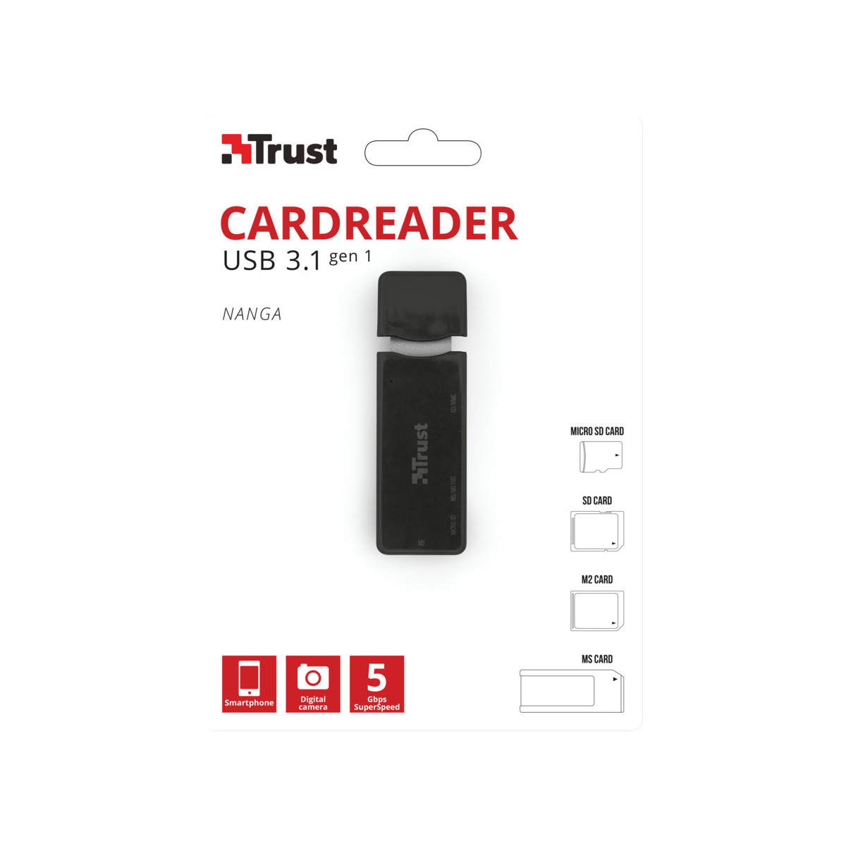 Trust NANGA. Tipi schede di memoria: MS Micro (M2),Memory Stick (MS),MicroSD (TransFlash),SD, Colore del prodotto: Nero. Tipo interfaccia: USB 3.2 Gen 1 (3.1 Gen 1) Type-A. Sistema operativo Windows supportato: Windows 10 Education,Windows 10 Education x64,Windows 10 Enterprise,Windows 10 Enterprise..., Compatibilità sistema operativo Mac: Mac OS X 10.5 Leopard. Tipo di imballo: Scatola