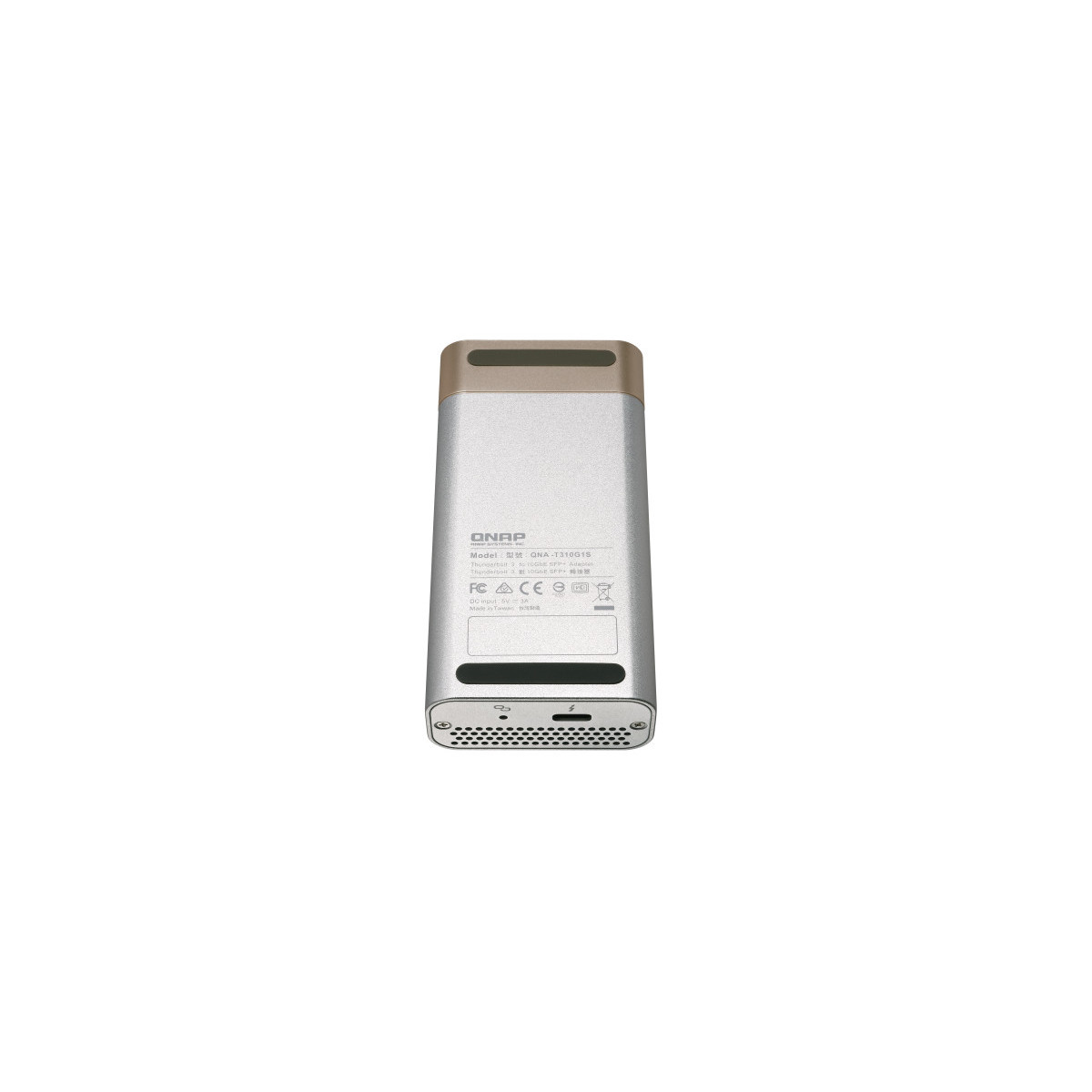 QNAP QNA-T310G1S. Interfaccia host: Thunderbolt 3, Interfaccia di uscita: SFP+. Colore del prodotto: Oro, Grigio, Indicatori LED: Attività, Collegamento, Potenza. Velocità massima di trasmissione: 10 Gbit/s. Sistema operativo Windows supportato: Windows 10 Education x64,Windows 10 Enterprise x64,Windows 10 Home x64,Windows 10 Pro x64,Windows..., Compatibilità sistema operativo Mac: Mac OS X 10.13 High Sierra,Mac OS X 10.14 Mojave. Larghezza: 56 mm, Profondità: 113,2 mm, Altezza: 27,6 mm
