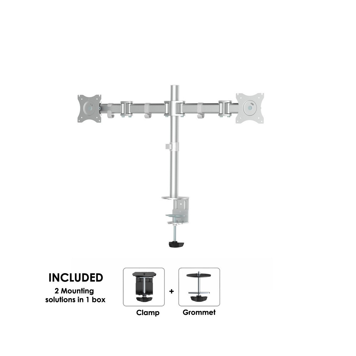 Questo braccio porta monitor NewStar, modello NM-D135DSILVER consente di collegare due schermi LCD/LED/TFT su di una scrivania con la modalità di fissaggio su piano attraverso vite centrale o morsetto.