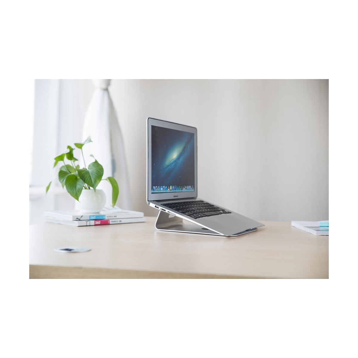 Il wrest piedini in silicone antiscivolo e laptop aumenta la stabilità e previene graffi. Sul retro del prodotto c'è un foro per il cavo di organizzare ordinatamente i cavi.