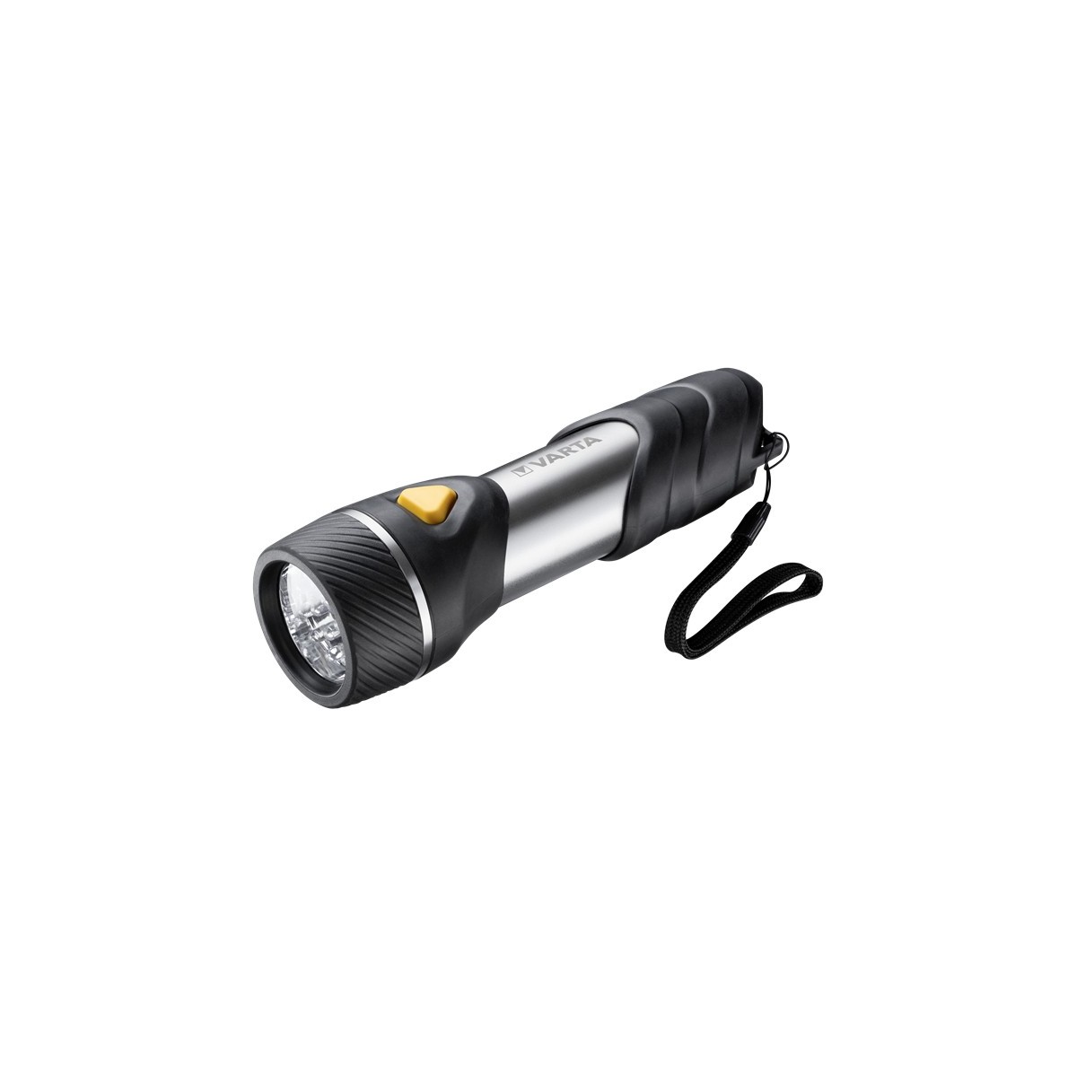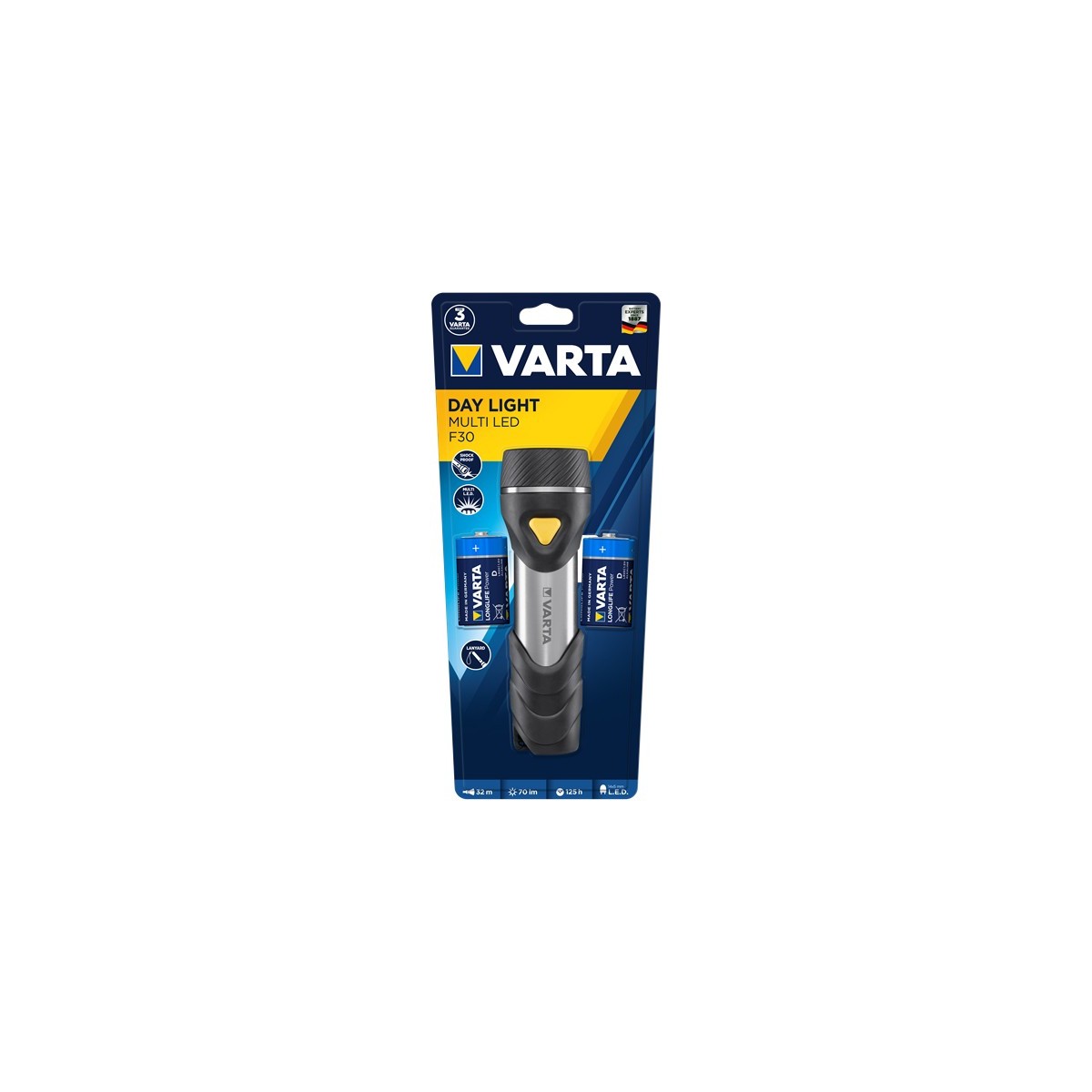 Varta Day Light Multi LED F30. Tipo di lampada: Torcia a mano, Colore del prodotto: Nero, Argento, Giallo, Materiale della scocca: ABS sintetico, Alluminio, Gomma. Tipo di lampada: LED, Quantità lampade: 14 lampada(e), Flusso luminoso: 70 lm. Tipo batteria: D, Durata batteria: 125 h. Profondità: 197,5 mm, Peso: 473,1 g, diametro testa: 6,3 cm