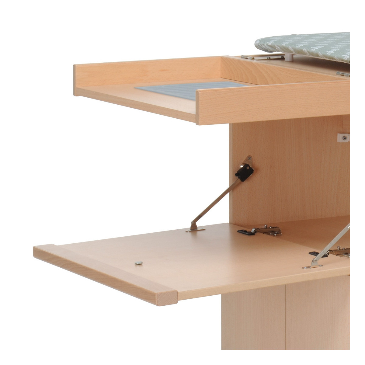 La solida struttura del mobiletto è in truciolare nobilitato, il telaio di sostegno al piano da stiro è in legno massiccio di faggio verniciato, mentre il piano da stiro in multistrato di pioppo ha fori traspiranti.