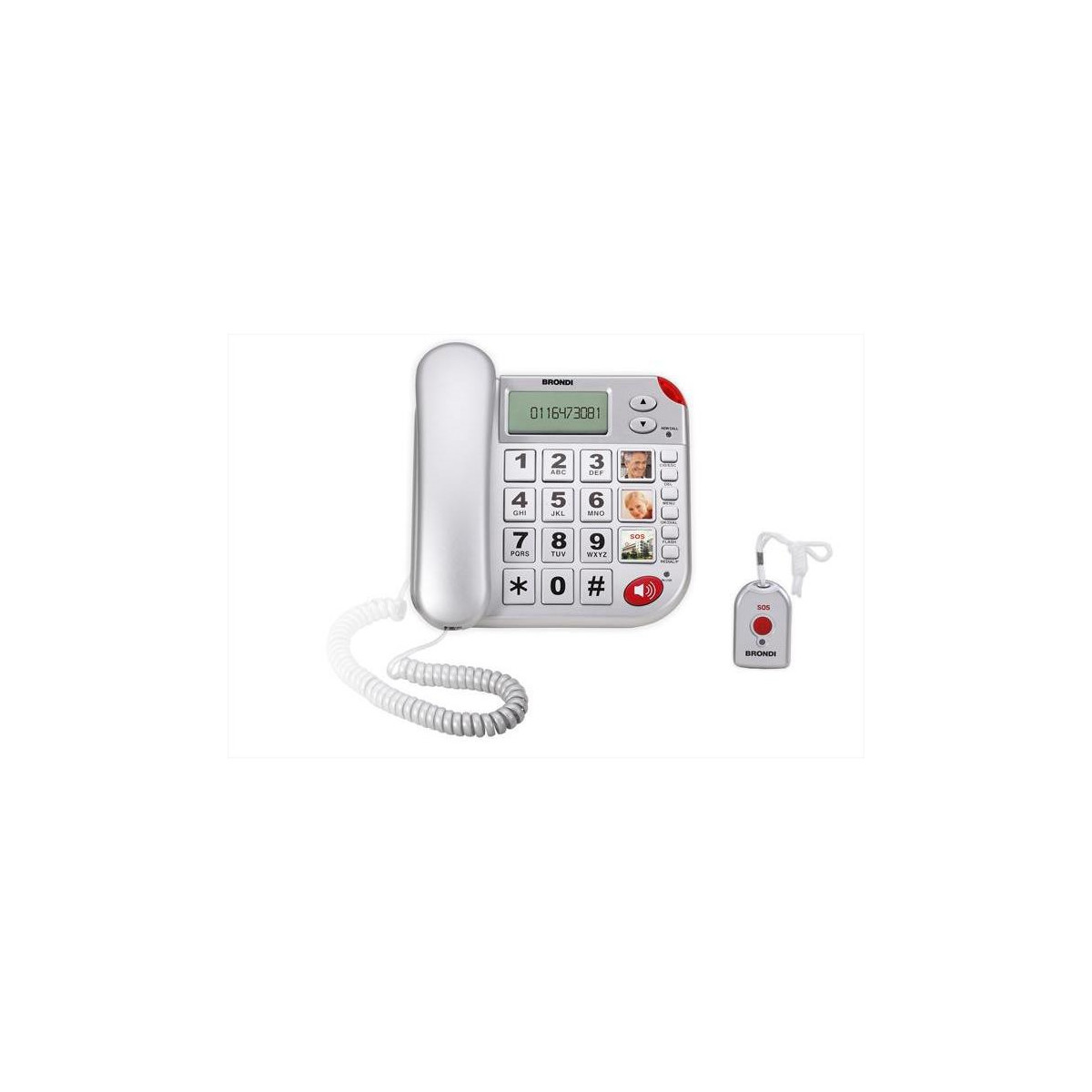 Telefono corded con telecomando per chiamata dei numeri preprogrammati (max 30), possibilità di rispondere alla chiamata con il telecomando, vivavoce, menu vocale, grandi tasti, atsti e rubrica parlante, rubrica con 30 memorie, 3 tasti con foto intercambiabili, indicatori luminosi di nuova chiamata o di linea impegnata.
