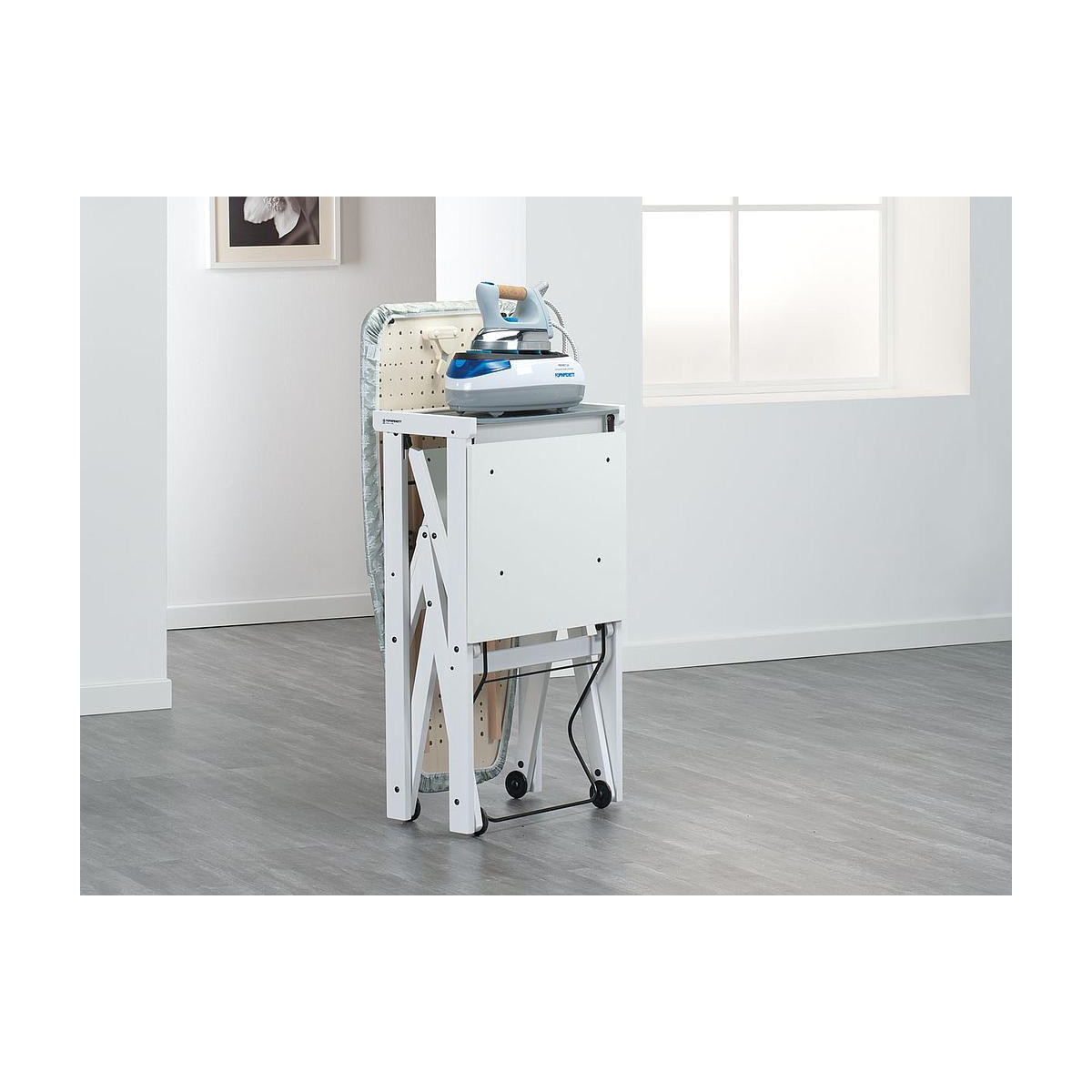 Progettato per fornire il massimo comfort, Asso è anche un grande alleato per tenere in ordine la casa quando non utilizzato: si chiude completamente occupando il minimo spazio, mantenendo il ferro da stiro al suo posto. Le due ruote gommate antigraffio permettono di spostarlo con grande facilità.