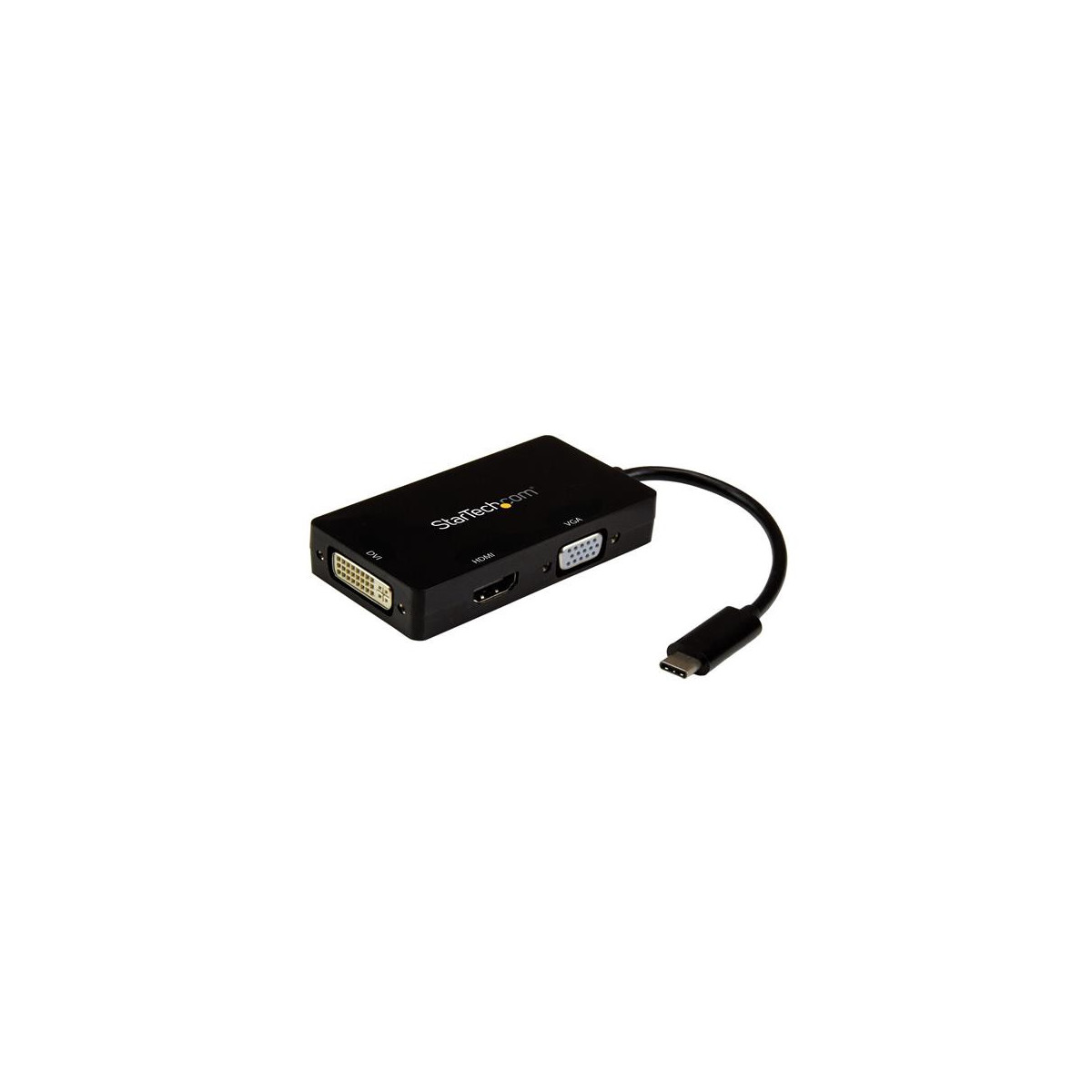 StarTech.com Adattatore Multiporta USB-C - Scheda Grafica Esterna 3 in 1 USB Tipo-C a HDMI, DVI o VGA. Connettore USB: USB tipo-C, Tipo di connettore USB: Maschio, Tipo di connettore DVI: DVI-I. Colore del prodotto: Nero, Lunghezza cavo USB: 0,15 m. Larghezza: 45 mm, Profondità: 85 mm, Altezza: 15 mm