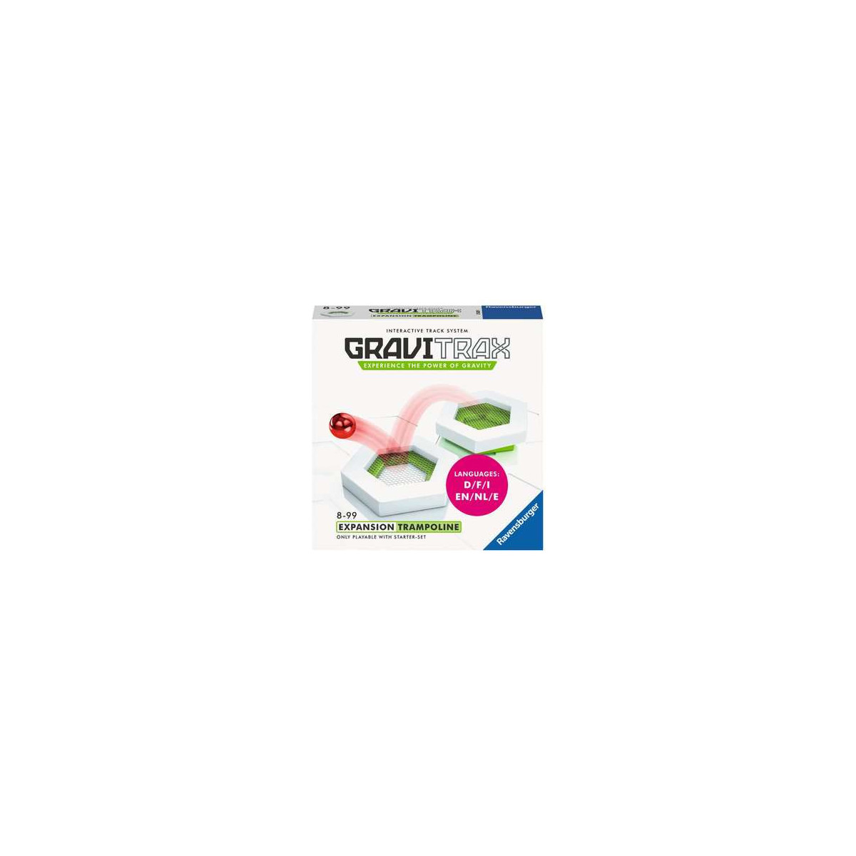 Con GraviTrax puoi esplorare la gravità senza mai annoiarti, perché i pezzi aggiuntivi ti permettono di ampliare il tuo percorso all’infinito. Fai rimbalzare la biglia! Sfida la forza di gravità e fai saltare la biglia con i tappeti elastici. Utilizzali insieme allo Starter-Set GraviTrax per rendere ancora più divertente e movimentata la pista. Quanto in alto e in lungo salterà la tua biglia? Da utilizzare solo in abbinamento a GraviTrax Starter Set.