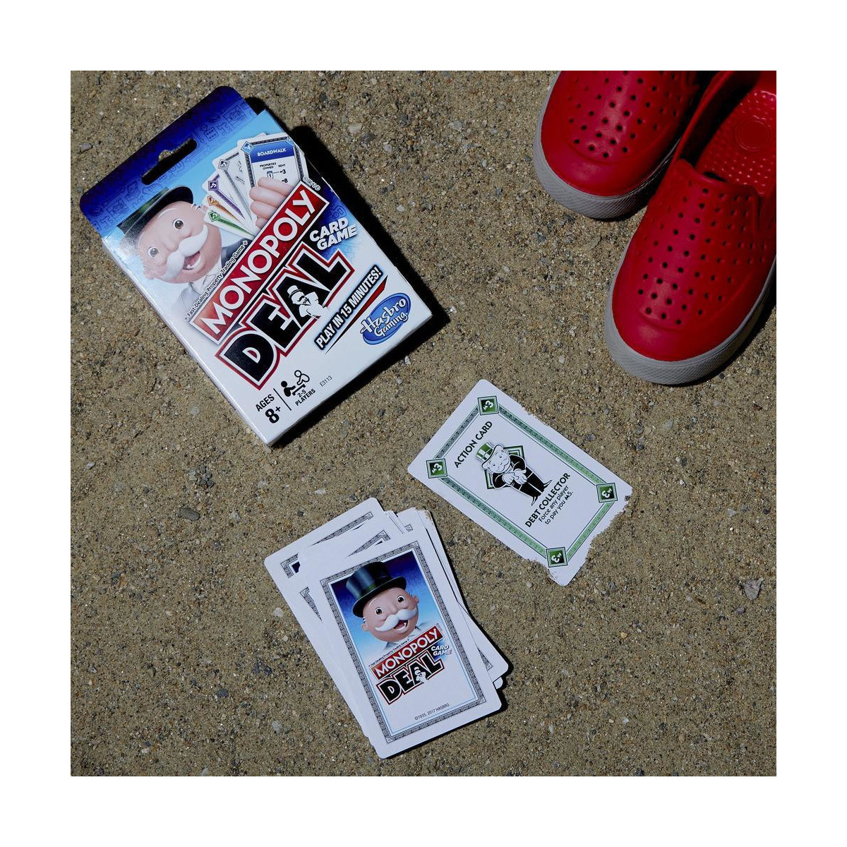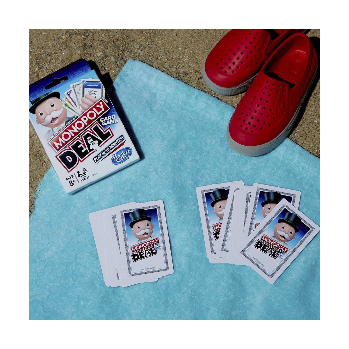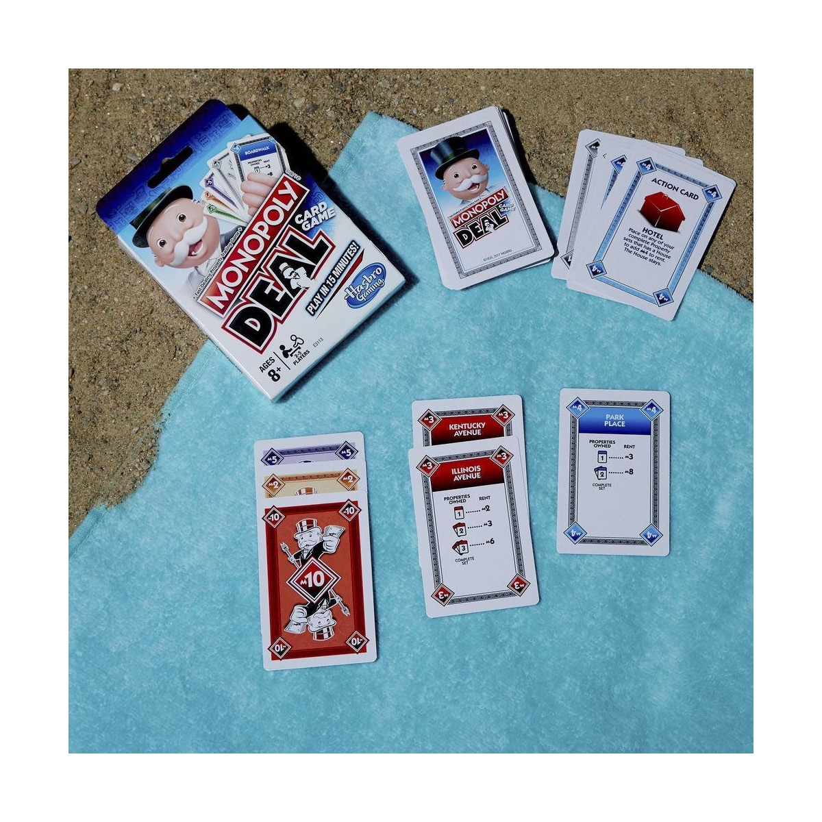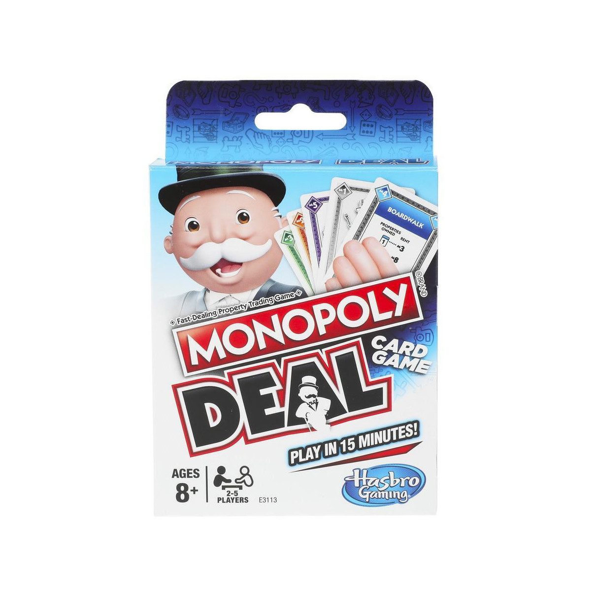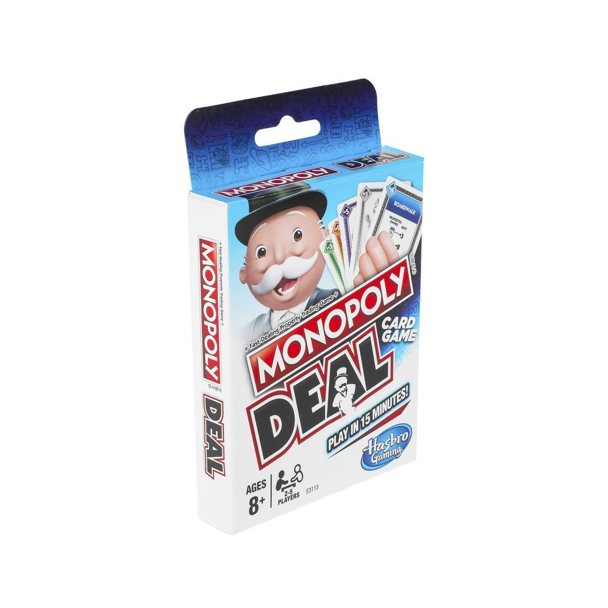 Il Gioco di carte Monopoly Deal racchiude tutto il divertimento del gioco Monopoly in un velocissimo gioco di carte. Ha 110 carte che includono Carte proprietà, Carte affitto, Carte casa e hotel e Carte proprietà convertibili. Le Carte azione permettono ai giocatori di eseguire azioni come addebitare l’affitto e fare affari delicati. Le Carte casa e hotel aumentano il valore dell’affitto. Le Carte proprietà convertibili aiutano i giocatori a costruire set di Proprietà. E, i giocatori pagano i debiti con Carte moneta. Sii il primo giocatore a ottenere 3 set di Carte proprietà completi di diversi colori per vincere. Questo gioco di carte è un ottimo modo di giocare al Gioco di commercio delle proprietà, con rapidi affari, in soli 15 minuti! I nomi e i loghi Hasbro, Hasbro Gaming, Parker Brothers e Monopoly, nonché il disegno distintivo del tabellone, le quattro caselle angolari, il nome e il personaggio Mr. Monopoly, ogni elemento distintivo del tabellone e pezzo del gioco sono marchi commerciali di Hasbro in ordine al proprio gioco di compravendita di proprietà e alle attrezzature di gioco.
