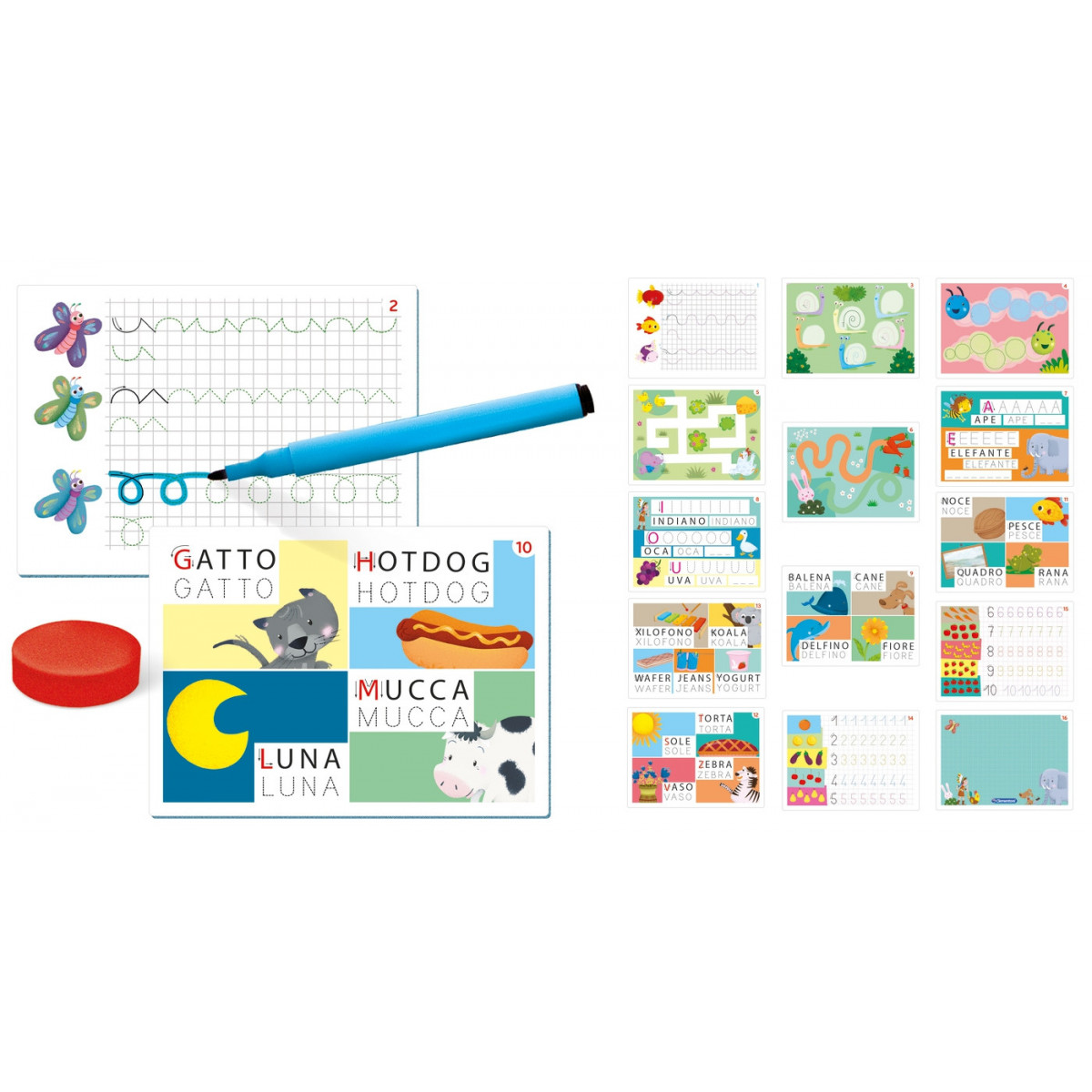 Un gioco educativo semplice e divertente per imparare a scrivere le lettere e le prime parole grazie a lavagnette colorate riscrivibili con l’apposito pennarello.