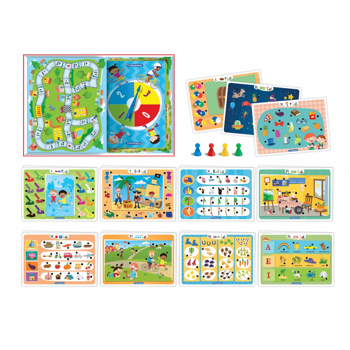 Un gioco educativo con 32 schede e 64 attività di gioco per apprendere lettere, parole, numeri, quantità, forme e colori.