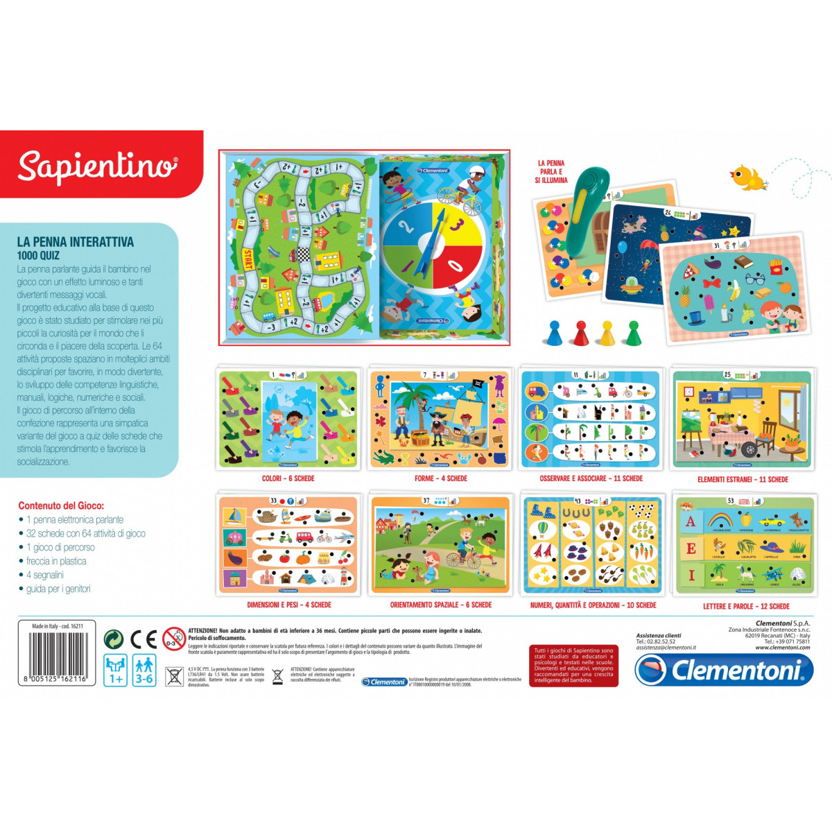 Clementoni Sapientino - La Penna Interattiva 1000 Quiz. Colore del prodotto: Multicolore, Età suggerita: Bambino, Genere consigliato: Ragazzo/Ragazza. Tipologia alimentazione: Batteria, Tipo batteria: LR41. Avviso CSS UE: Non adatto per bambini con età inferiore ai 36 mesi. Larghezza imballo: 451 mm, Profondità imballo: 70 mm, Altezza imballo: 311 mm. Contenuto della scatola: 32 schede illustrate, penna interattiva, batterie., Accessori inclusi nel set: Penna elettronica