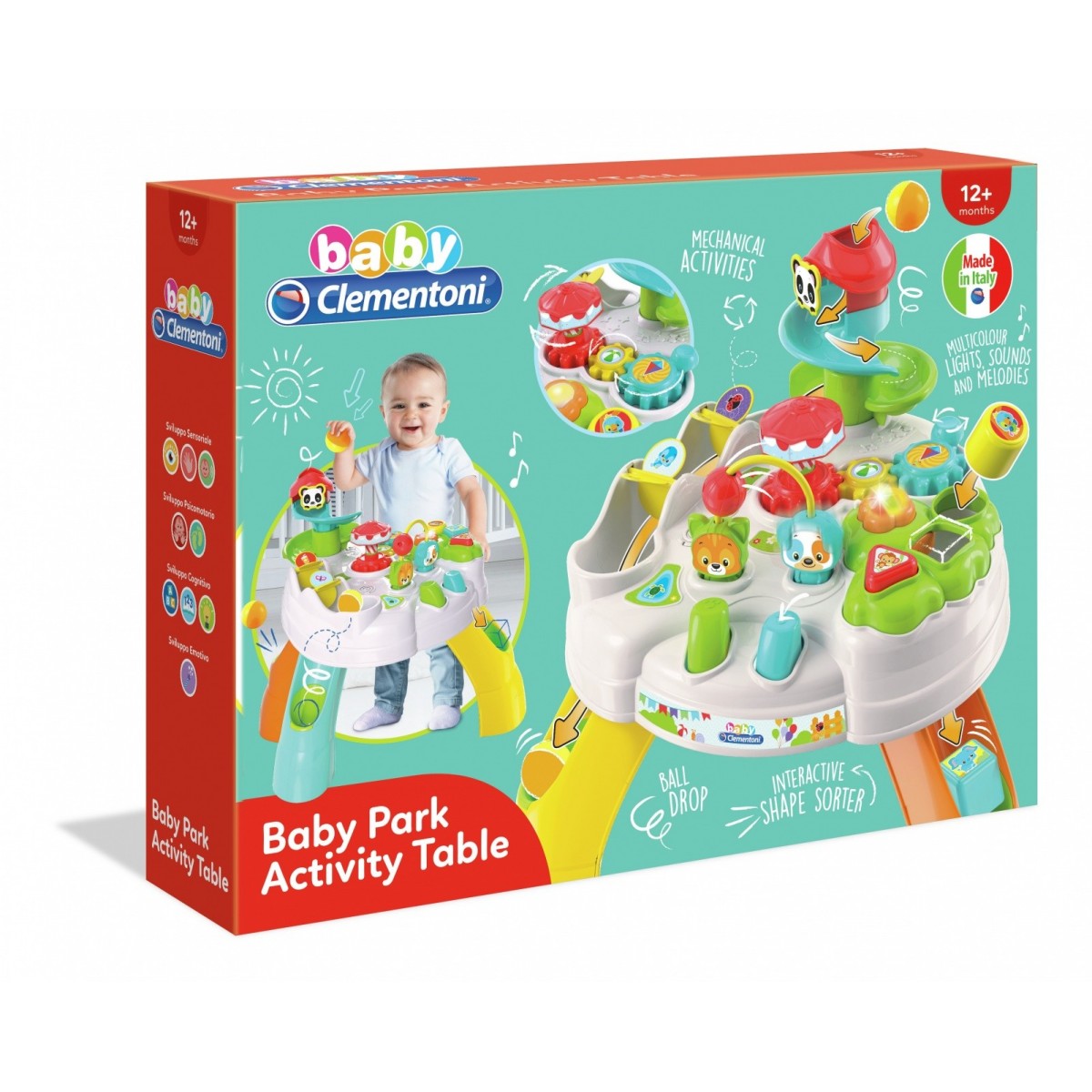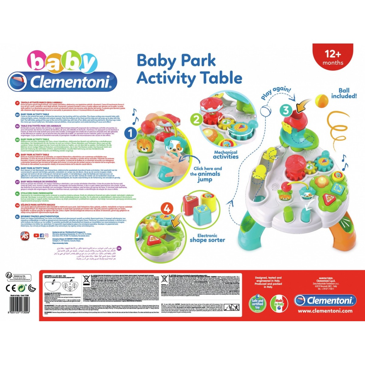 Clementoni Tavolo Happy Park. Colore del prodotto: Multicolore, Genere consigliato: Ragazzo/Ragazza, Età consigliata (min): 1 anno/i. Avviso CSS UE: Solo per uso domestico. Tipologia alimentazione: Batteria, Tipo batteria: Mini Stilo AAA. Larghezza imballo: 580 mm, Profondità imballo: 125 mm, Altezza imballo: 440 mm. Quantità per cartone principale: 6 pezzo(i)