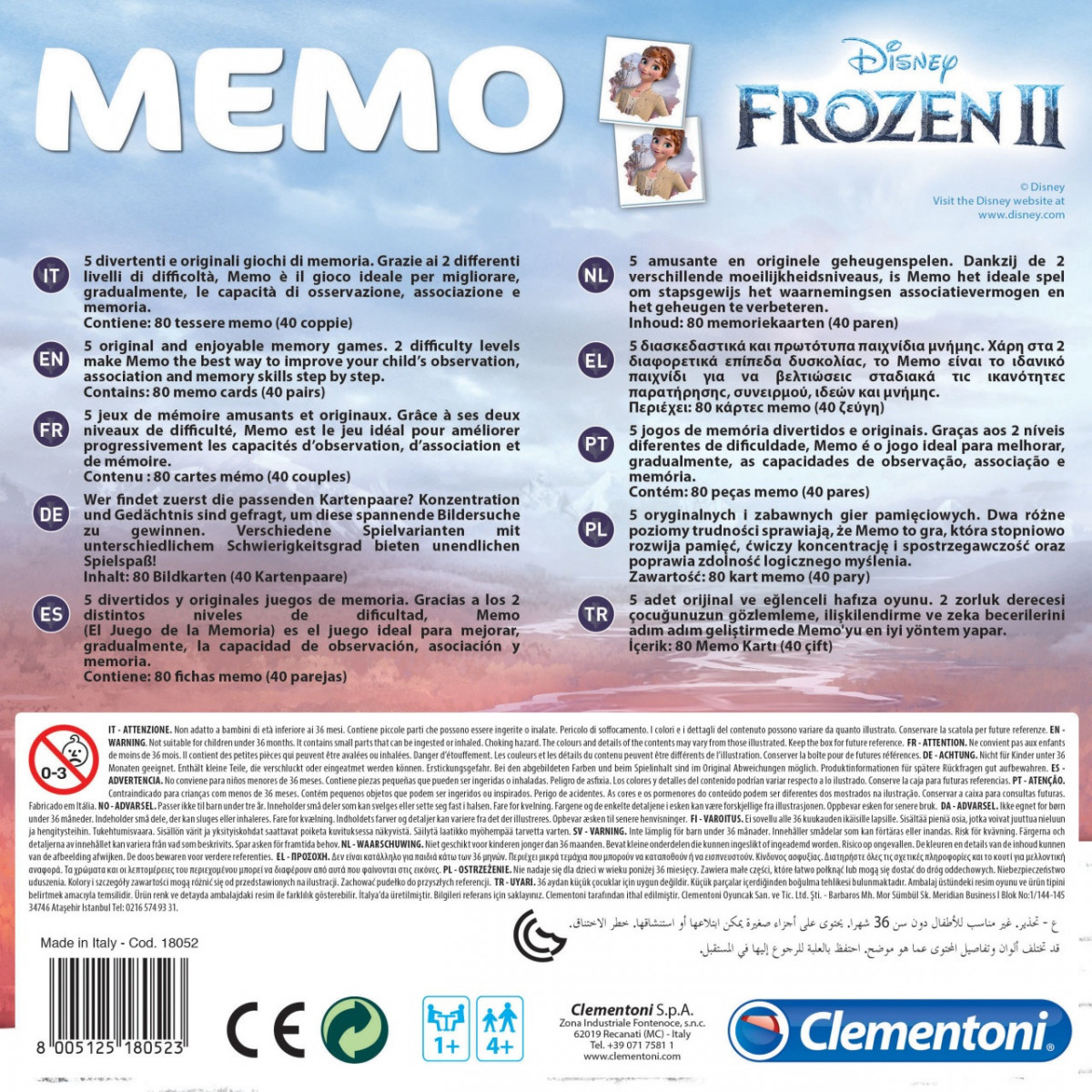 Clementoni Memo Disney Frozen 2. Genere: Gioco da tavolo di apprendimento, Pubblico di destinazione: Bambini, Genere consigliato: Ragazzo/Ragazza. Larghezza imballo: 210 mm, Profondità imballo: 47 mm, Altezza imballo: 210 mm. Contenuto della scatola: 80 tessere memo