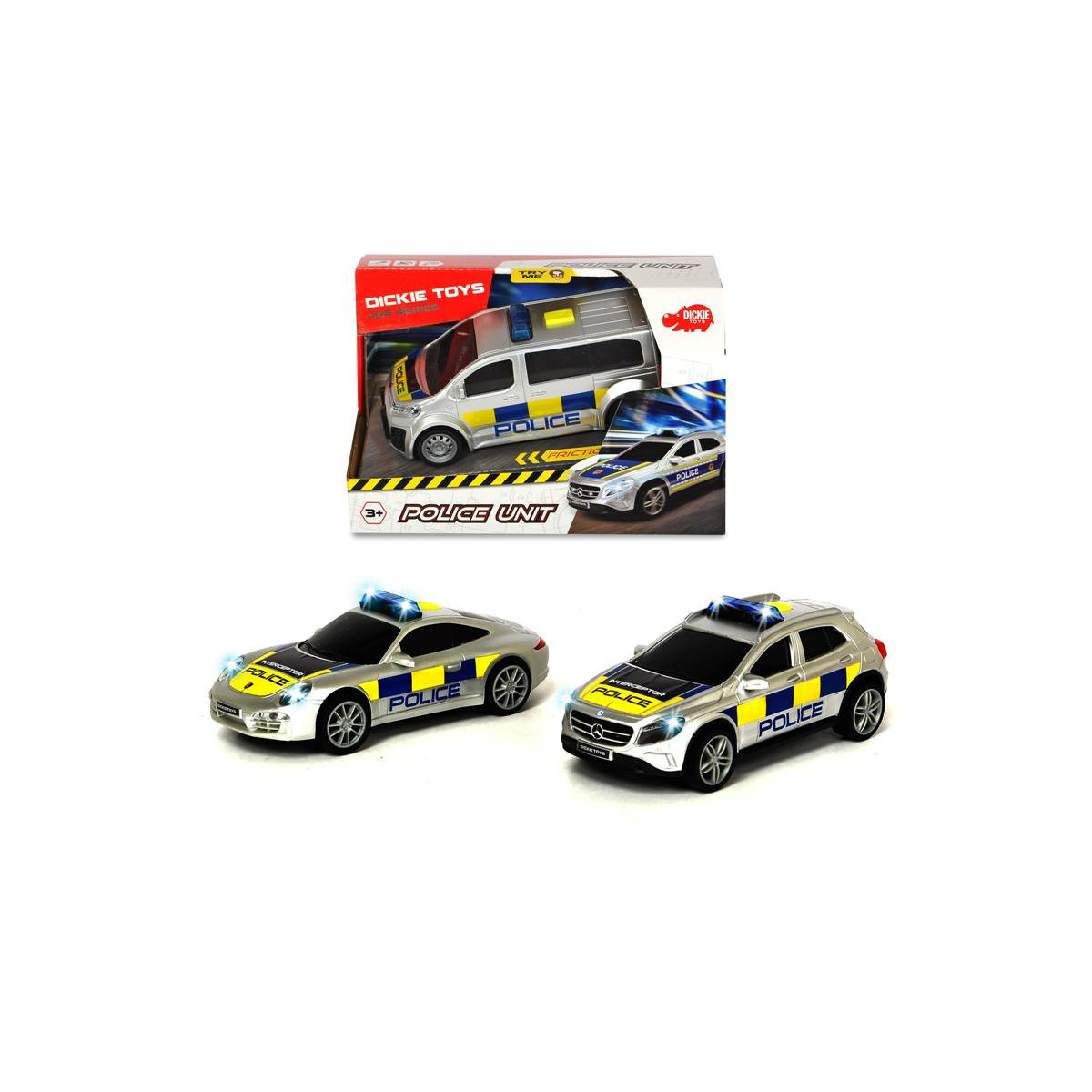 SOS Police Unit, 3-asst. cm. 15, scala 1:32, luci e suoni, try me. L'assortimento comprende 3 Porsche, 2 Mercedes e 1 Citroe'n