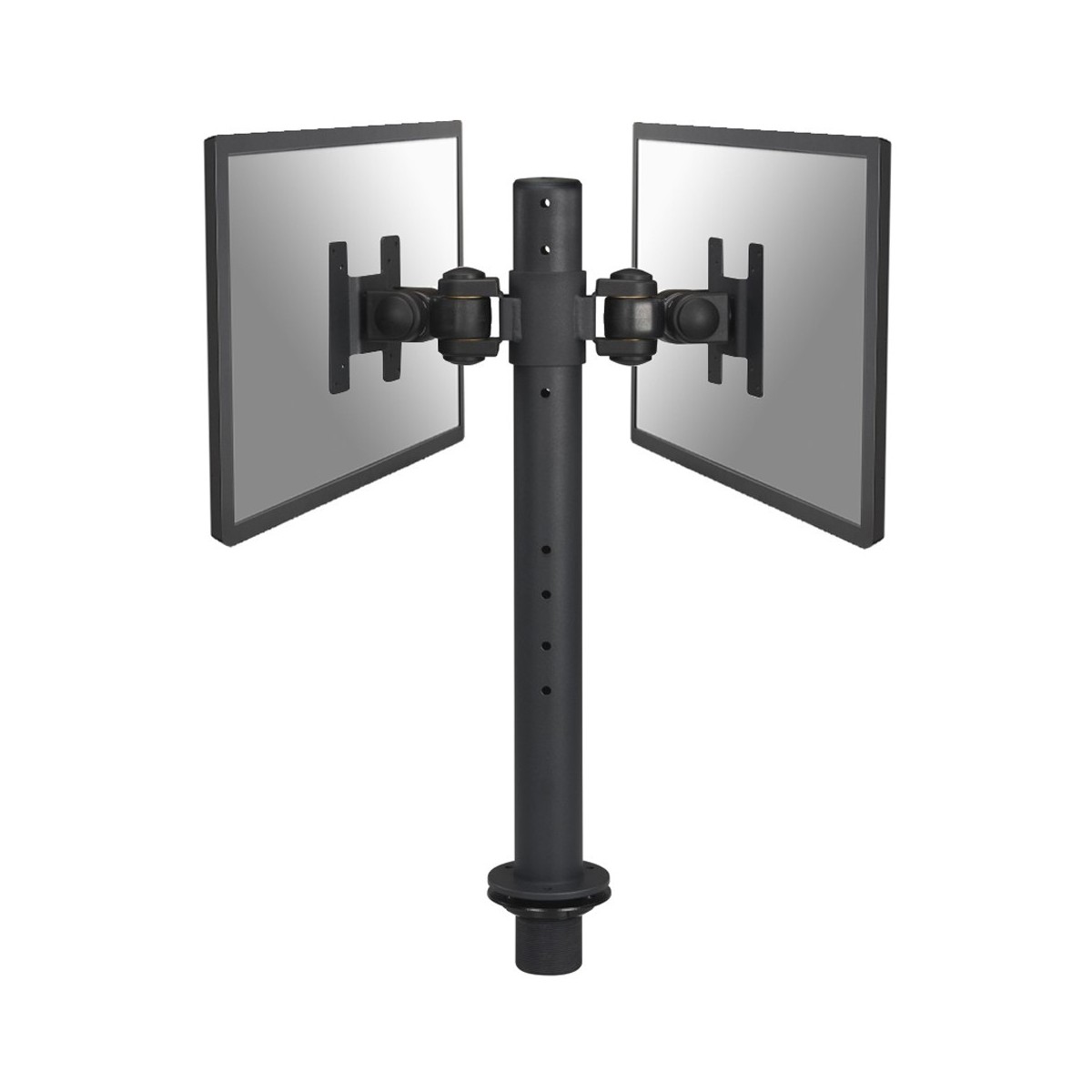 Questo braccio porta monitor NewStar, modello FPMA-D050DBLACK consente di collegare due schermi LCD/LED/TFT in senso opposto su di una scrivania con la modalità di fissaggio su piano attraverso viti e foro passante con anello di tenuta.