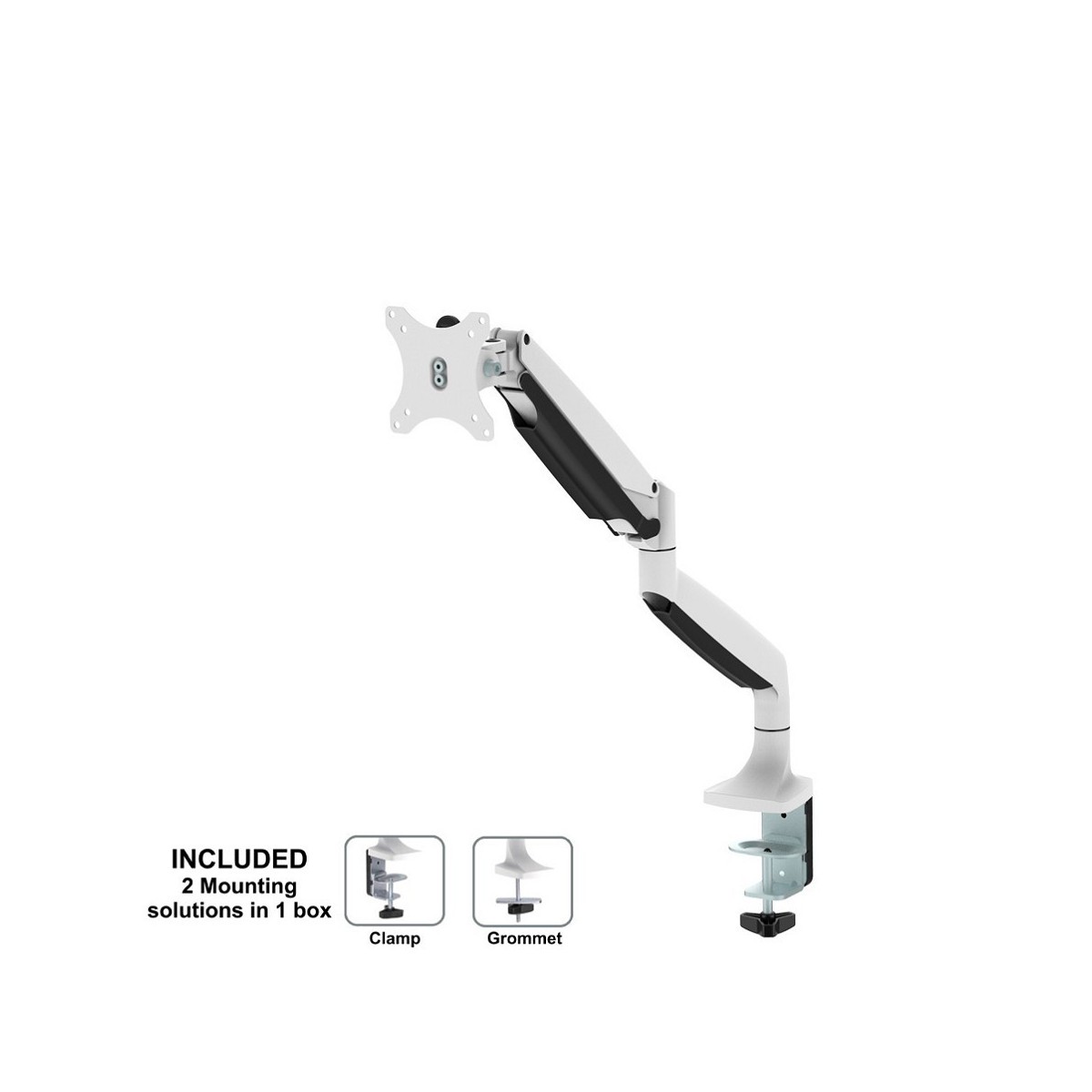 Questo braccio porta monitor NewStar, modello NM-D750WHITE consente di collegare uno schermo LCD/LED/TFT su di una scrivania con la modalità di fissaggio su piano attraverso un morsetto o vite centrale (entrambe sono incluse).