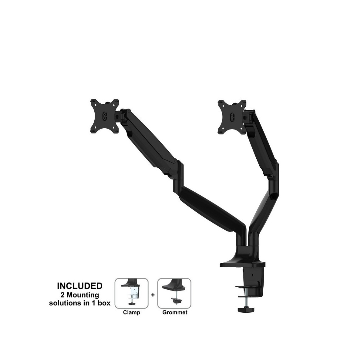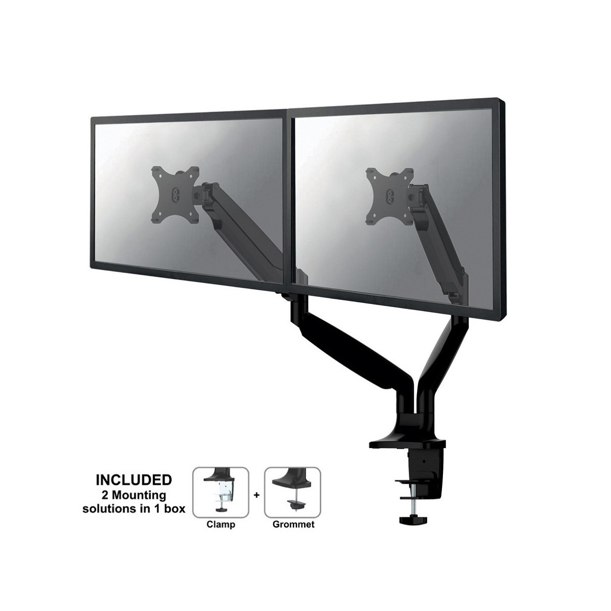Questo braccio porta monitor NewStar, modello NM-D750DBLACK consente di collegare due schermi LCD/LED/TFT su di una scrivania con la modalità di fissaggio su piano attraverso un morsetto o vite centrale (entrambe sono incluse).