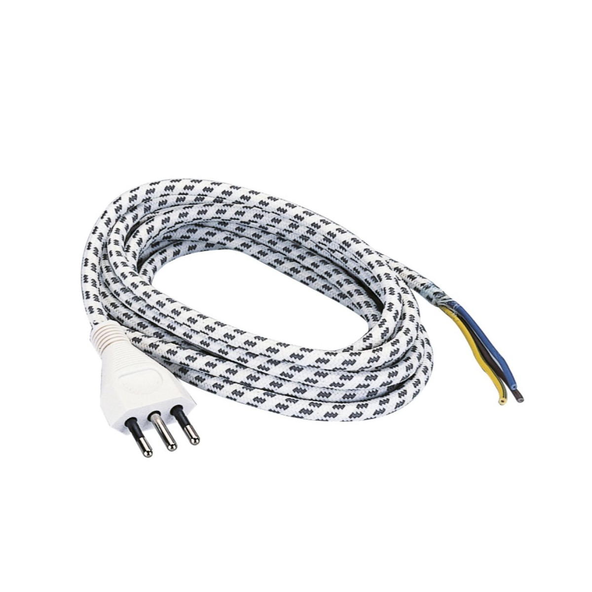 Cavo di alimentazione 250 V~ per ferro da stiro, tipo H03RT-F 3 x 0,75 mm², lunghezza 3 m, spina 10 A 2P+T. Colore: bianco / nero.