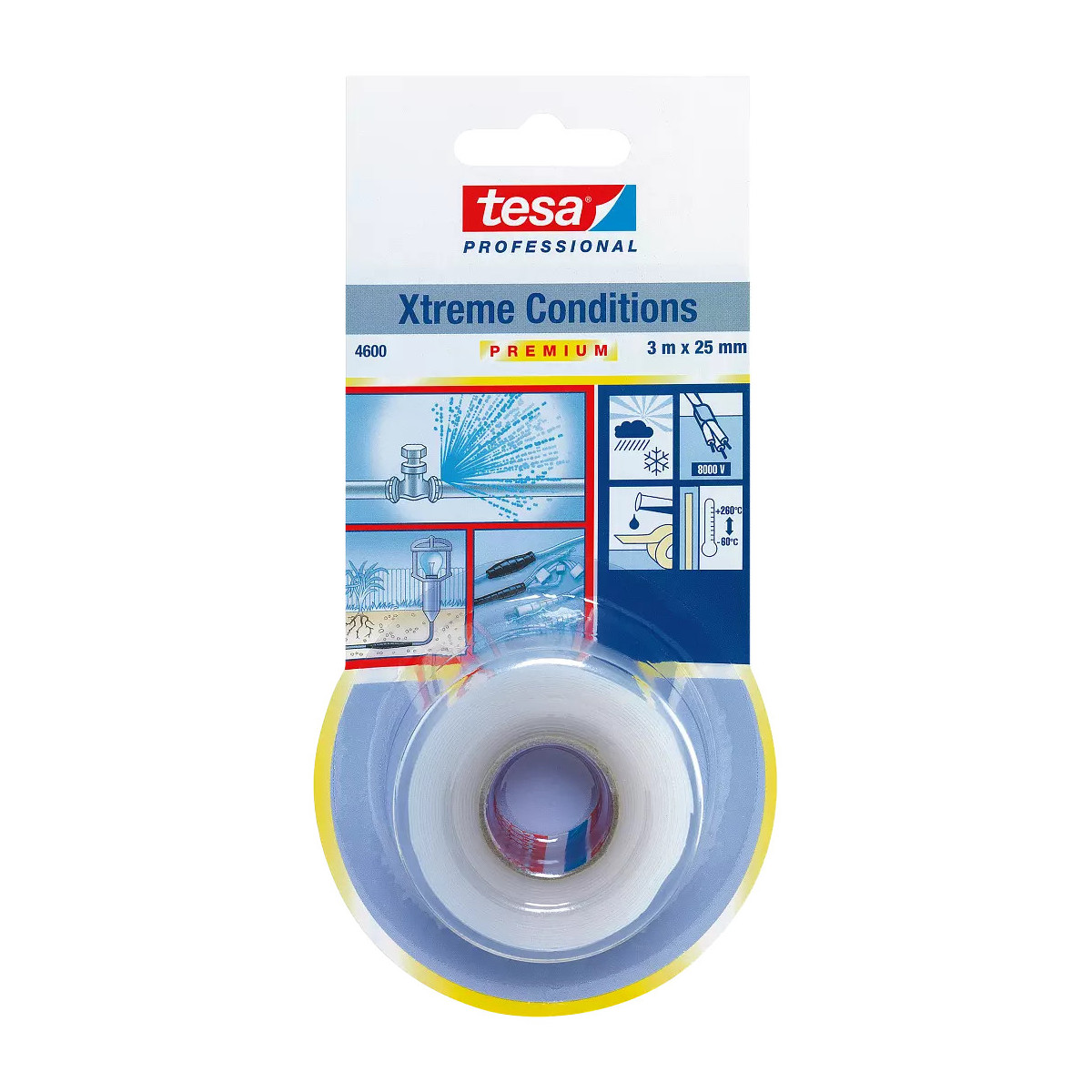 tesa® 4600 è un nastro autoamalgamante realizzato in silicone e viene fornito con un liner trasparente. Viene applicato avvolgendo il nastro su se stesso. La fusione di tesa® 4600 con il suo supporto crea una sigillatura permanente a tenuta d'acqua. Non sono necessari tempi di asciugatura. Il suo materiale flessibile può essere applicato in modo uniforme su qualsiasi tipo di superficie, inclusi substrati bagnati o caldi, sporchi o unti. tesa® 4600 Xtreme Conditions può essere utilizzato anche per applicazioni temporanee senza lasciare residui una volta rimosso. Il nastro può essere applicato addirittura sott'acqua. Grazie ai suoi componenti in silicone il nastro vanta una resistenza eccellente a diverse sostanze chimiche, oli, acidi, solventi, acqua salata, radiazioni UV e temperature estreme.