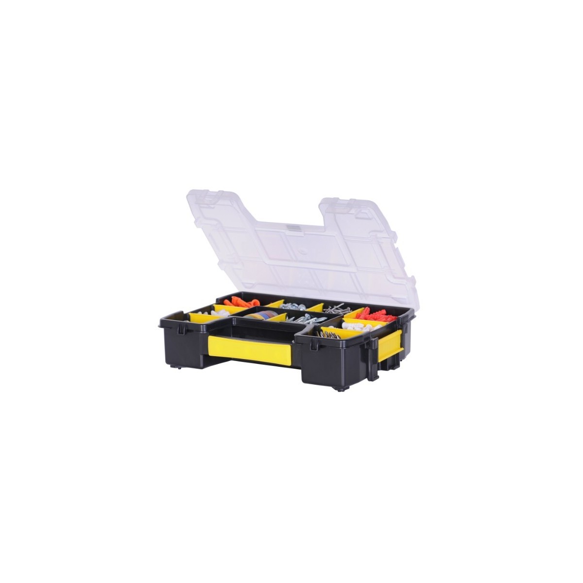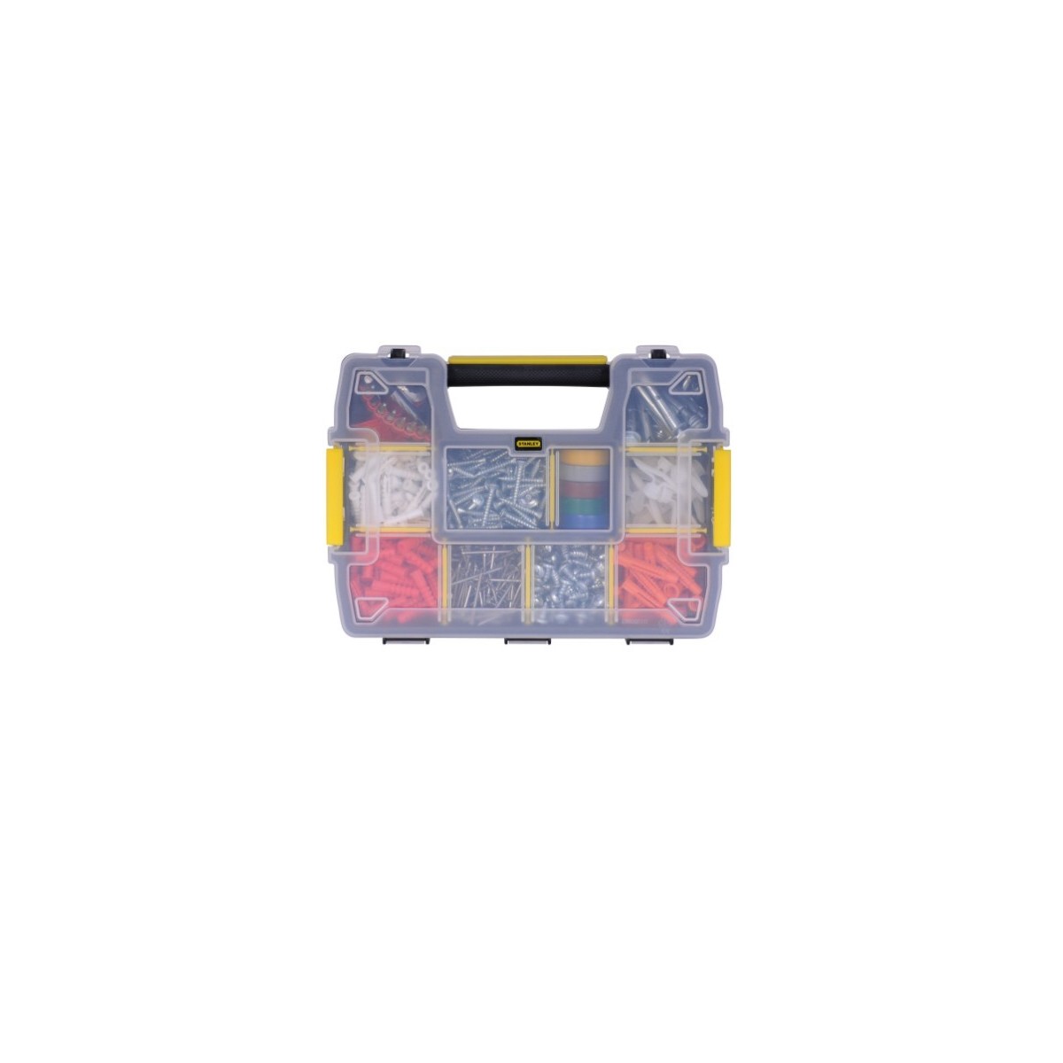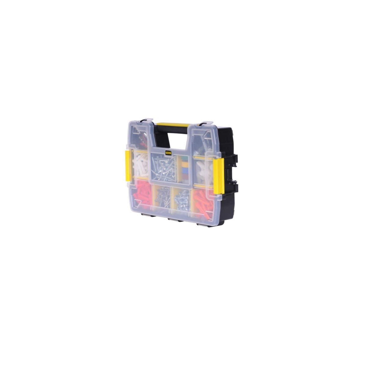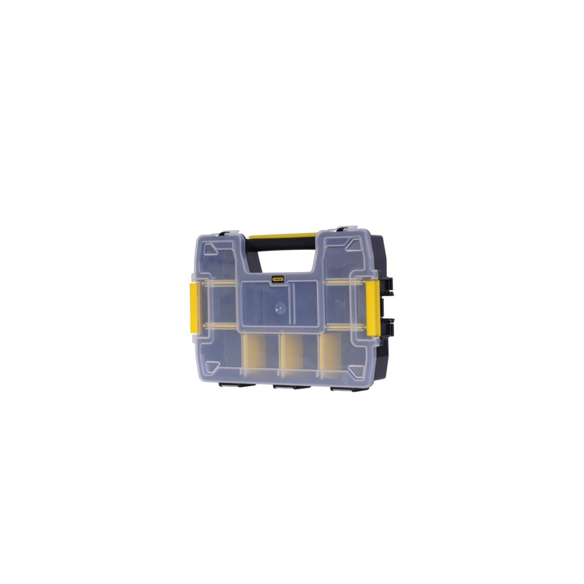 Cassetta Organizer STANLEY 11 scomparti. Coperchio trasparente a chiusura ermetica, nessun rischio di mischiare il contenuto. Manico preformato nel corpo. Doppia chiusura. 1-92-736. Cm.24x5x17.