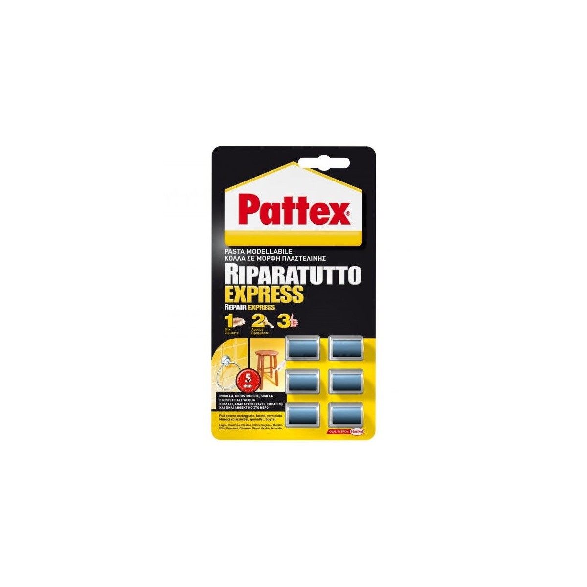 Pattex Riparatutto Express. Sostanza: Pasta, Tipo di adesivo: Adesivo epossidico. Tempo di asciugatura: 5 min. Capacità: 30 g. Tipo di imballo: Blister
