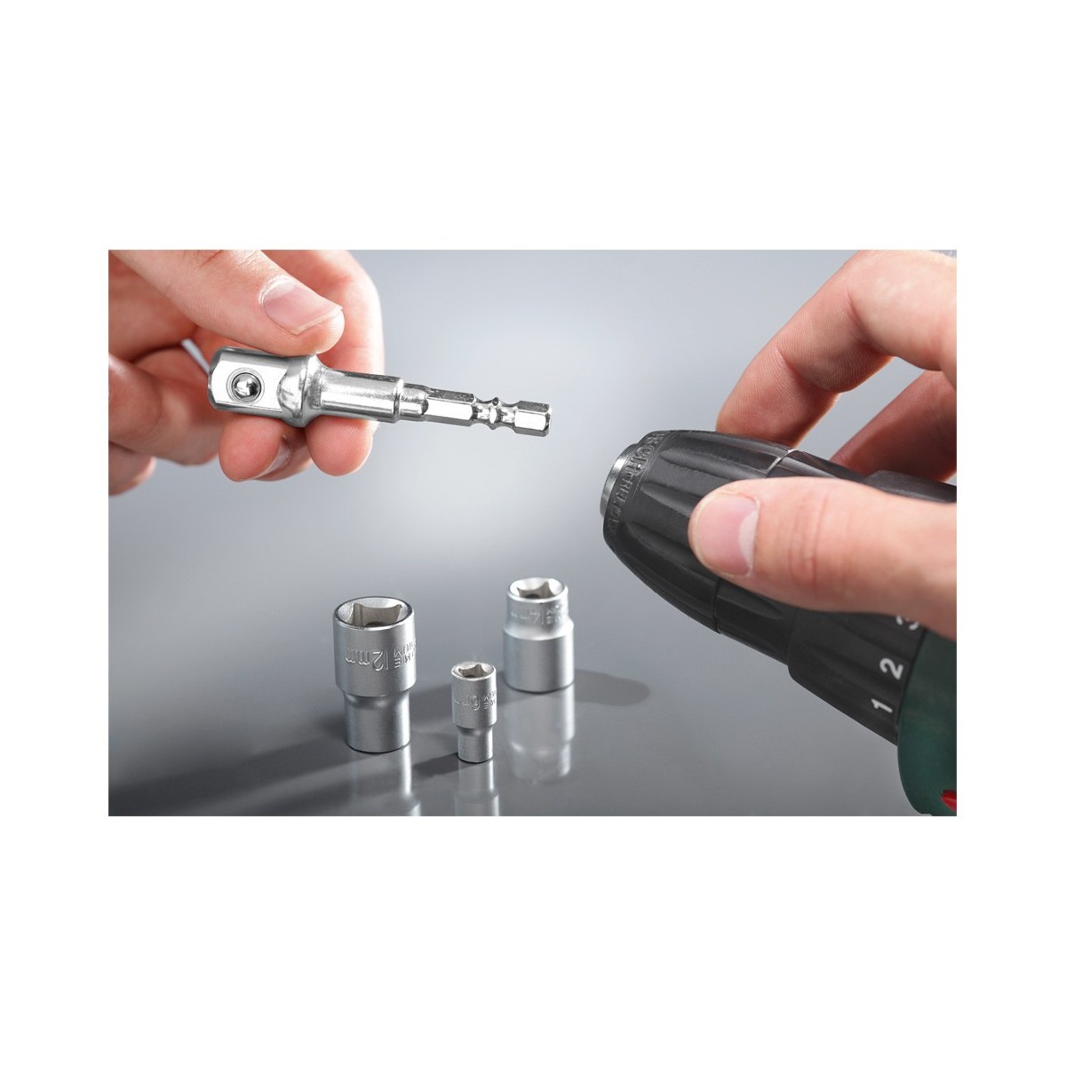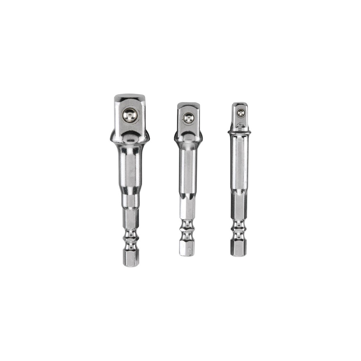Set 3 adattatori per bussole CV. Attacco esagonale 1/4", 3/8", 1/2". Codice Einhell 105310.