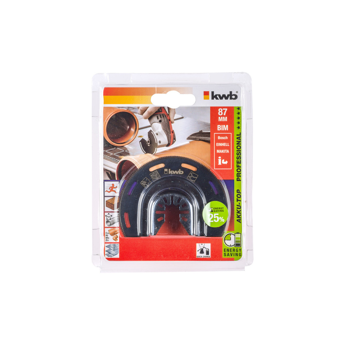kwb 709450. Tipo di prodotto: Lama per sega universale, Adatto per materiali: Alluminio, Rame, Vetroresina, Metallo, Tubo, Plastica, Legno, Colore del prodotto: Nero. Spessore di taglio (max): 1,5 cm. Lunghezza totale: 8,7 cm. Tipo di imballo: Blister
