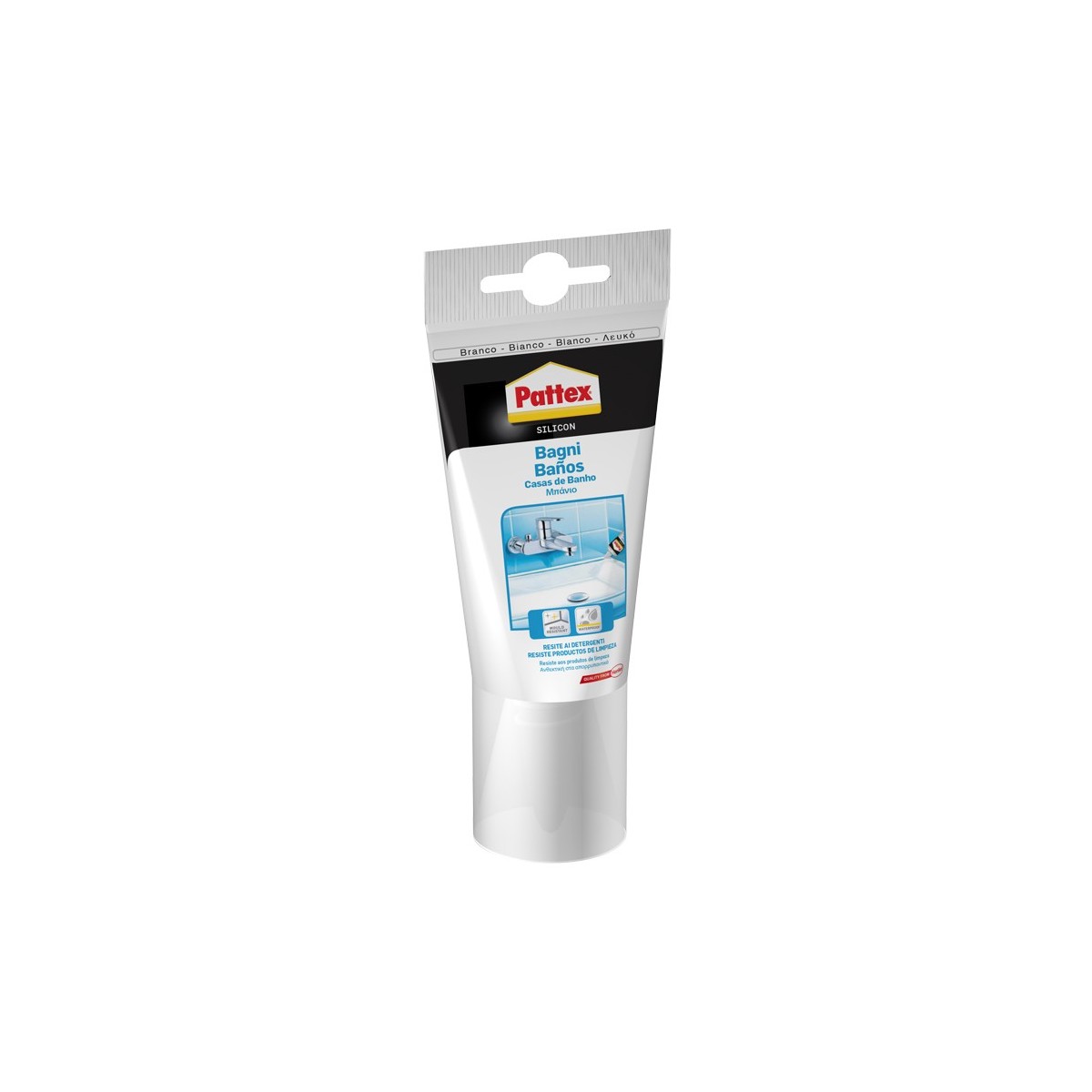 Pattex Bagni Bianco 150ml. Sostanza: Gel, Tipo di adesivo: Adesivo in silicone, Tipo di dispenser: Tubo. Tempo di asciugatura: 15 min, Temperatura di applicazione (min): 5 °C, Temperatura di applicazione (max): 40 °C. Volume: 150 ml