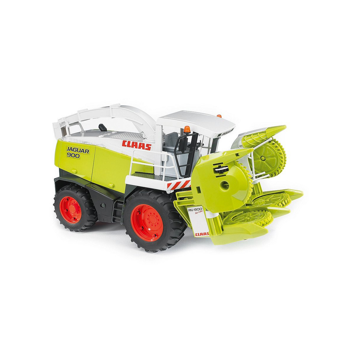 La falcia-trincia-caricatrice Claas Jaguar 900 è una riproposizione fedele dell?originale, ovvero una delle mietitrici di maggior spicco dell'azienda leader nel settore in Europa. Il modello si distingue per un becco spannocchiatore dotato di quattro lame di alimentazione azionate in marcia. Per garantire la funzionalità anche su terreni di gioco sconnessi, il becco spannocchiatore presenta una sospensione oscillante ed è stabilizzato al centro mediante una molla a torsione. Il becco spannocchiatore può anche essere rimosso, esponendo così alla vista il trinciatore. Per il trasporto su strada, è possibile sia piegare verso l?alto le lame di alimentazione esterne sia sollevare l'intero becco spannocchiatore. Come se non bastasse, il modello presenta anche sportelli apribili che consentono di dare uno sguardo alla tecnologia utilizzata, ad esempio motore e cinghia di trasmissione. La straordinaria bocca d?uscita può essere regolata in molti modi, proprio come per l?originale. A completare il quadro, asse oscillante in stile fuoristrada, pneumatici scolpiti e cabina del conducente parzialmente realizzata in vetro.