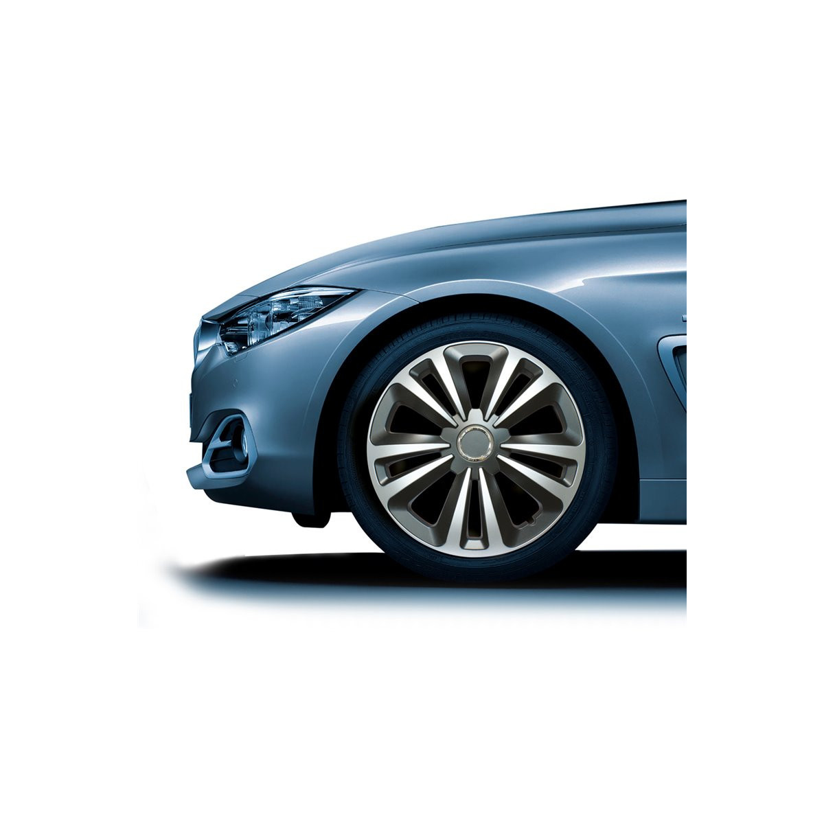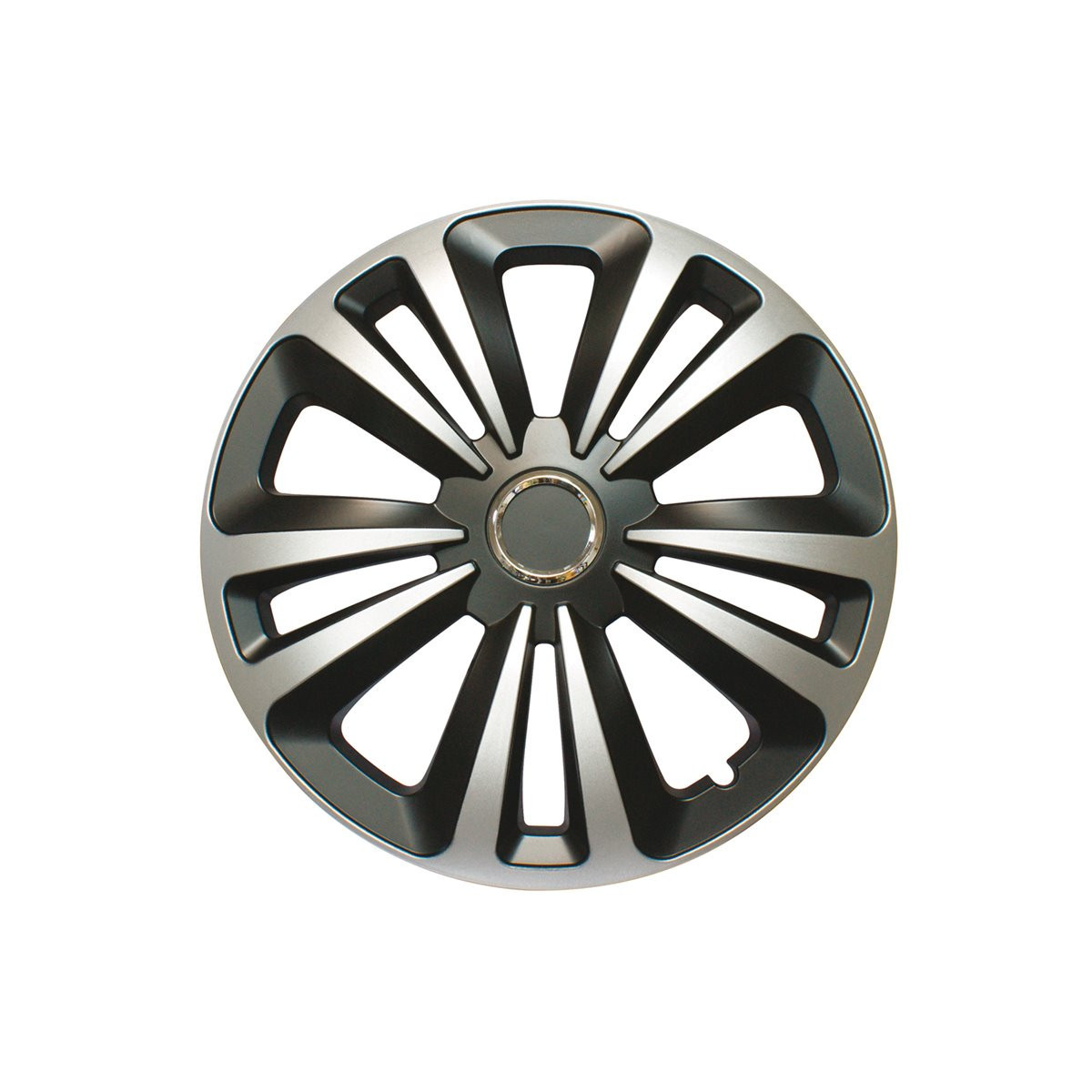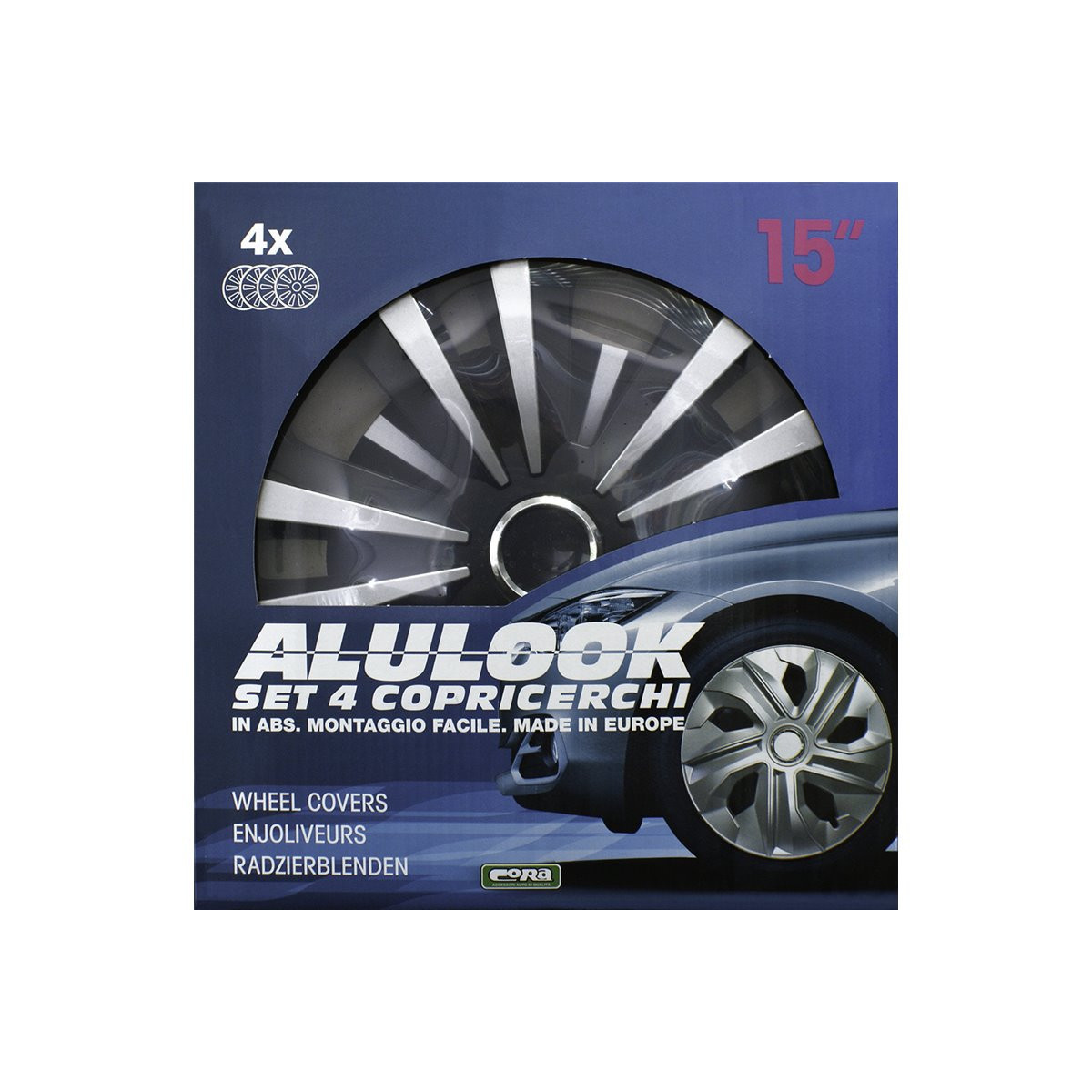 Set 4 copricerchi universali in abs antiurto di altissima qualità. Sistema di montaggio ultrarapido a pressione con anello metallico. Made in Europe. Per cerchi da 15''.