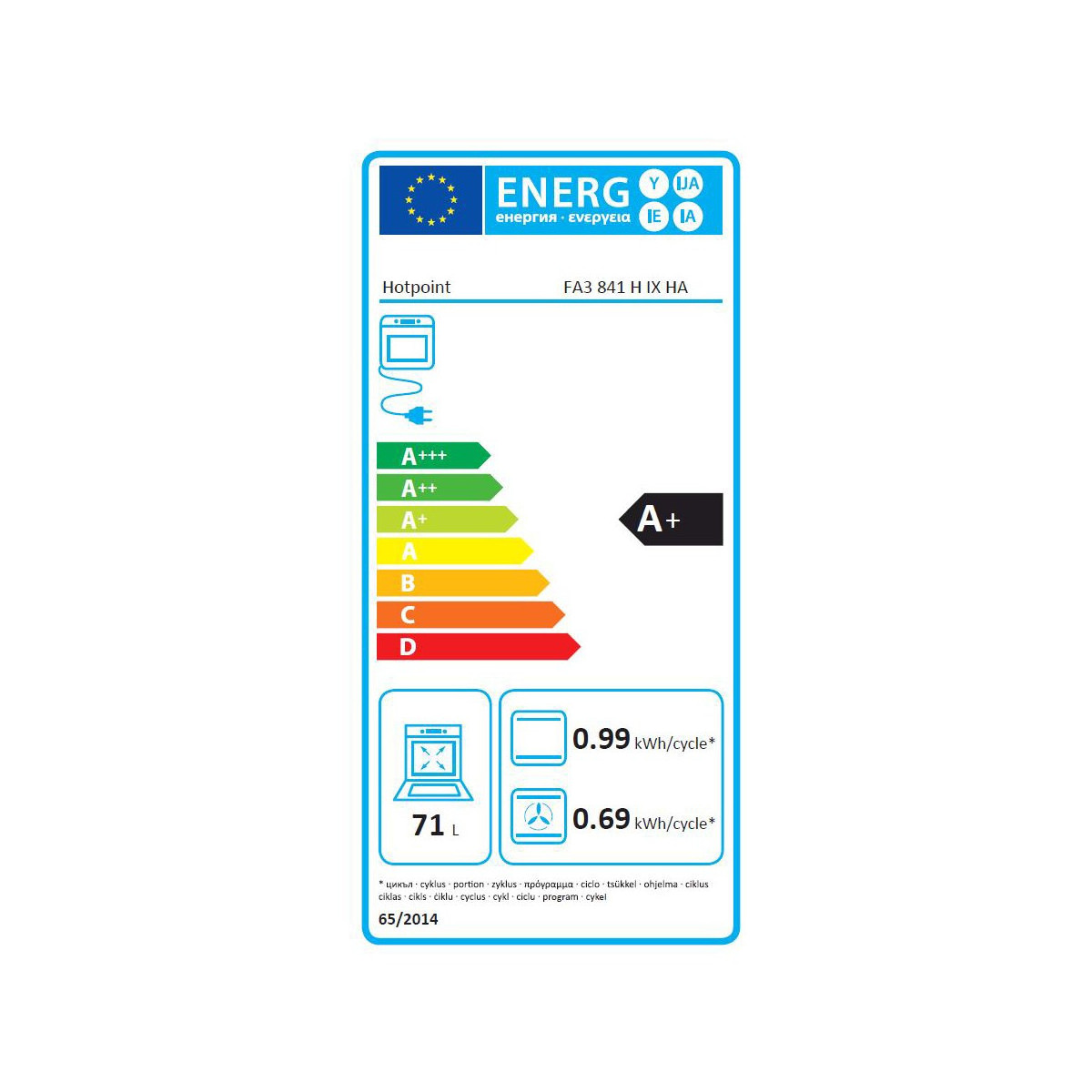 Hotpoint FA3 841 H IX HA. Dimensione del forno: Media, Tipo di forno: Forno elettrico, Capacità interna forno totale: 71 L. Posizionamento dell'apparecchio: Da incasso, Colore del prodotto: Nero, Acciaio inossidabile, Tipo di controllo: Manopola. Classe efficienza energetica: A+, Consumo energetico (convenzionale): 0,99 kWh, Consumo energetico (convezione forzata): 0,69 kWh. Larghezza del compartimento: 60 cm, Profondità del compartimento: 55,5 cm, Altezza del compartimento: 56 cm