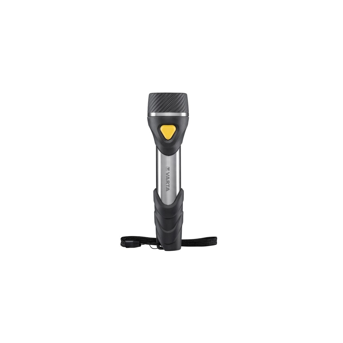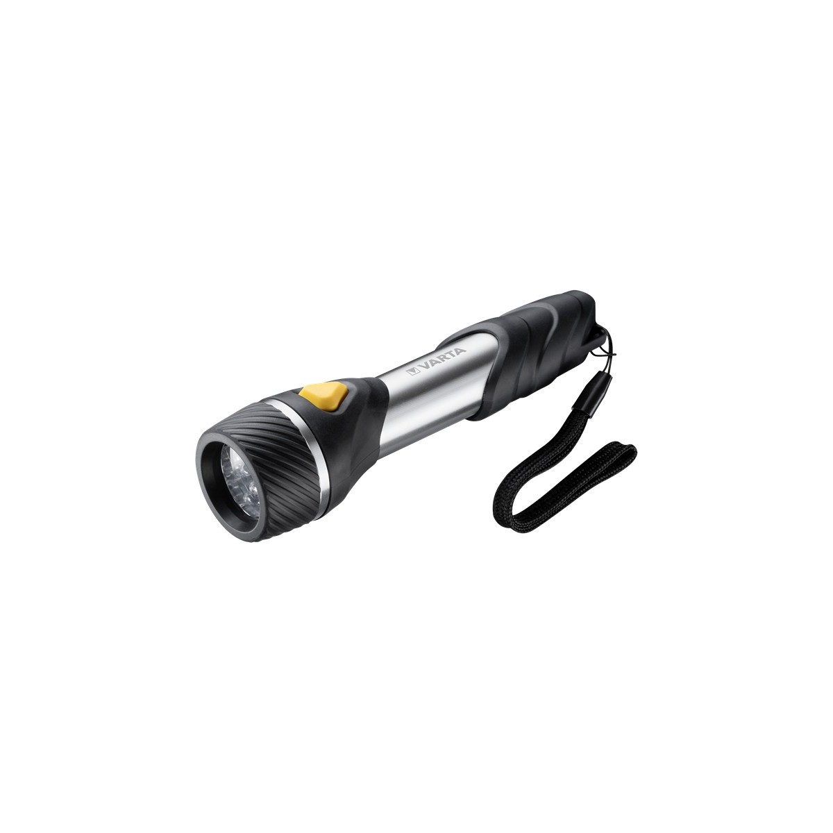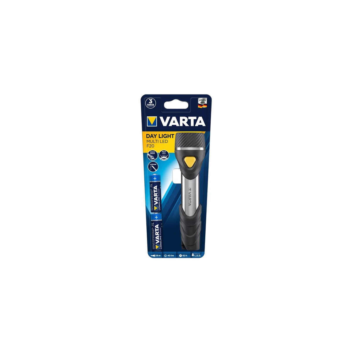 Varta Day Light Multi LED F20. Tipo di lampada: Torcia a mano, Colore del prodotto: Nero, Argento, Giallo, Materiale della scocca: ABS sintetico, Alluminio, Gomma. Tipo di lampada: LED, Quantità lampade: 9 lampada(e), Flusso luminoso: 40 lm. Tipo batteria: Stilo AA, Durata batteria: 62 h. Profondità: 163,5 mm, Peso: 133,8 g, diametro testa: 4,5 cm