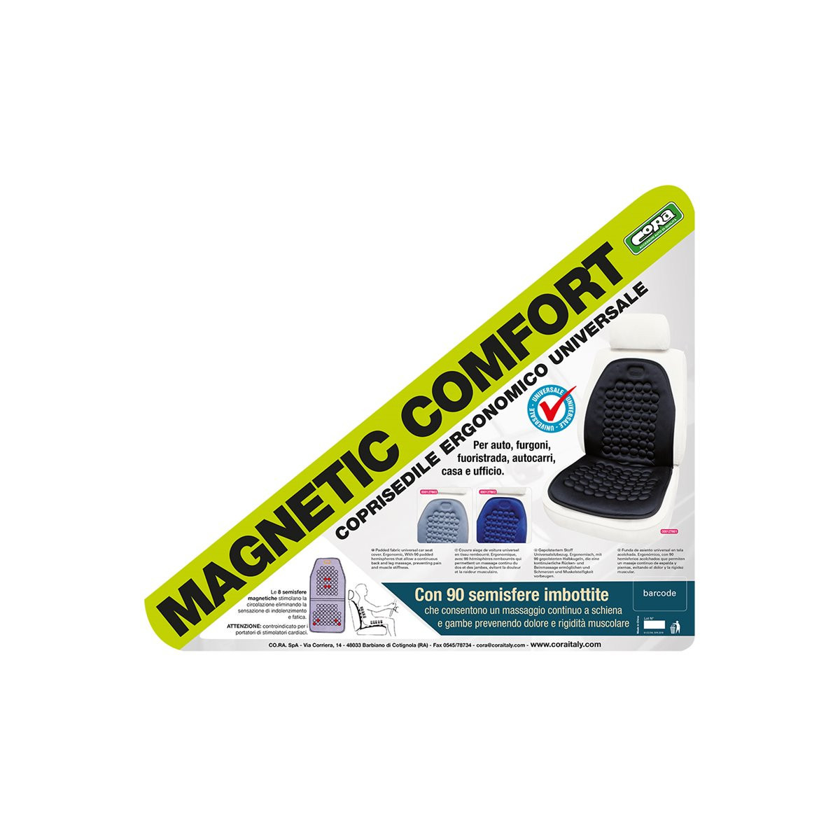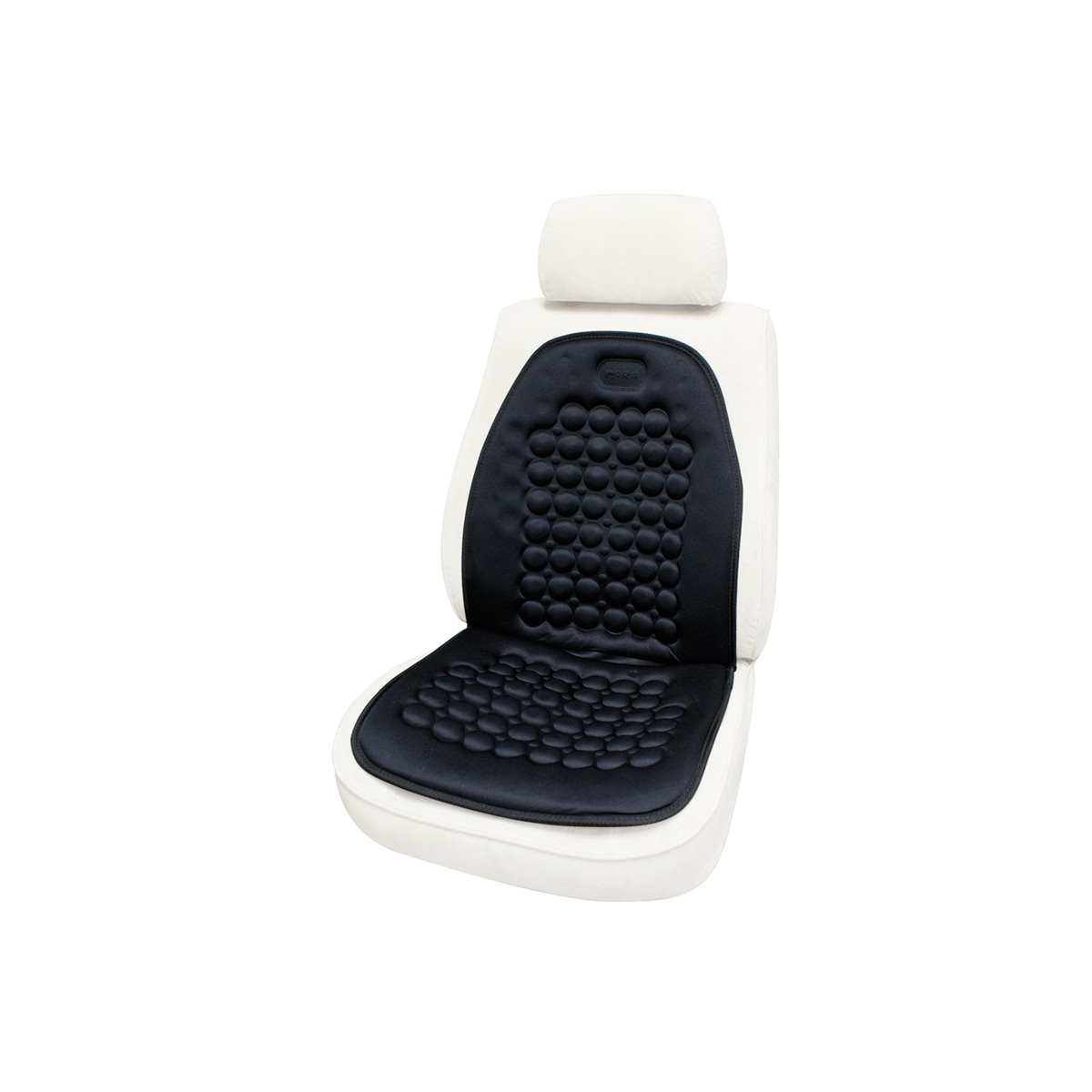 Coprisedile anteriore ergonomico e rilassante. Provvisto di 90 semisfere imbottite che producono un massaggio continuo a schiena e gambe ed aiutano a prevenire dolori e rigidità muscolare: delle 90 sfere appena descritte, 8 sono magnetiche e servono a stimolare la circolazione sanguigna e ad eliminare le sensazioni di indolenzimento e fatica ricorrenti nelle lunghe percorrenze. Compatibile con qualsiasi sedile di auto, furgoni, fuoristrada e autocarri. Ideale anche per la casa e l'ufficio. Avver tenze: prodotto controindicato per i portatori di stimolatori cardiaci. Colore nero.