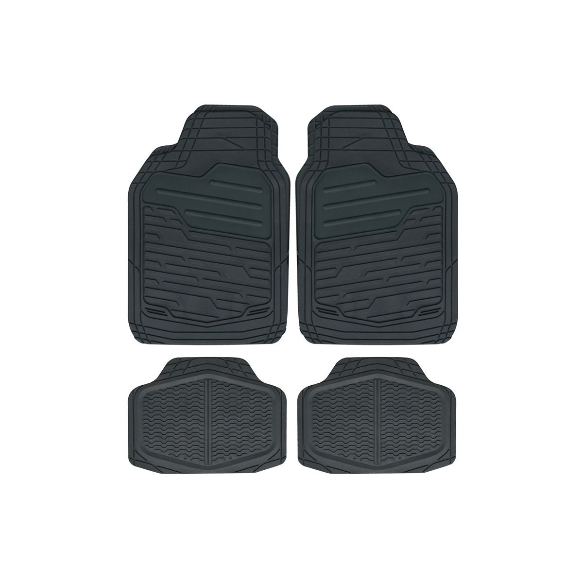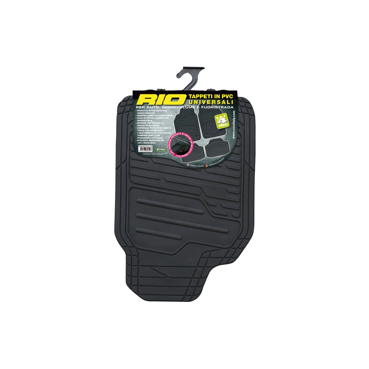 Serie completa di tappeti in pvc dal design moderno, resistentissimi e di lunga durata. Universali grazie alle linee di taglio che ne consentono l'adattamento ad ogni pianale compresi quelli con poggiapiede lato guida. Lato inferiore provvisto di dentini antiscivolo brevettati. Inodore, proteggono la moquette originale. Facili da pulire, lavabili con idropulitrice. Ecologici: materiale 100% riciclabile. Colore nero.