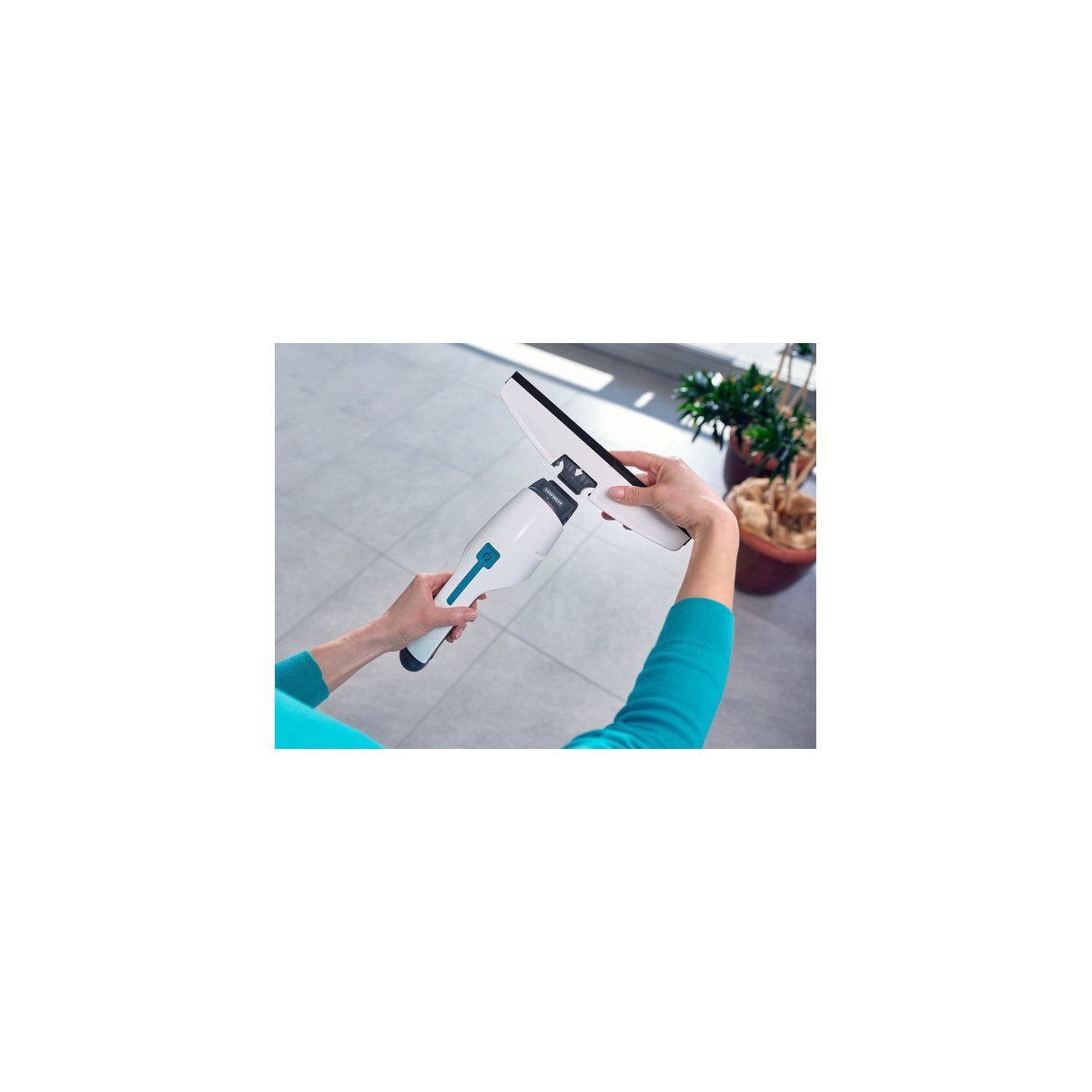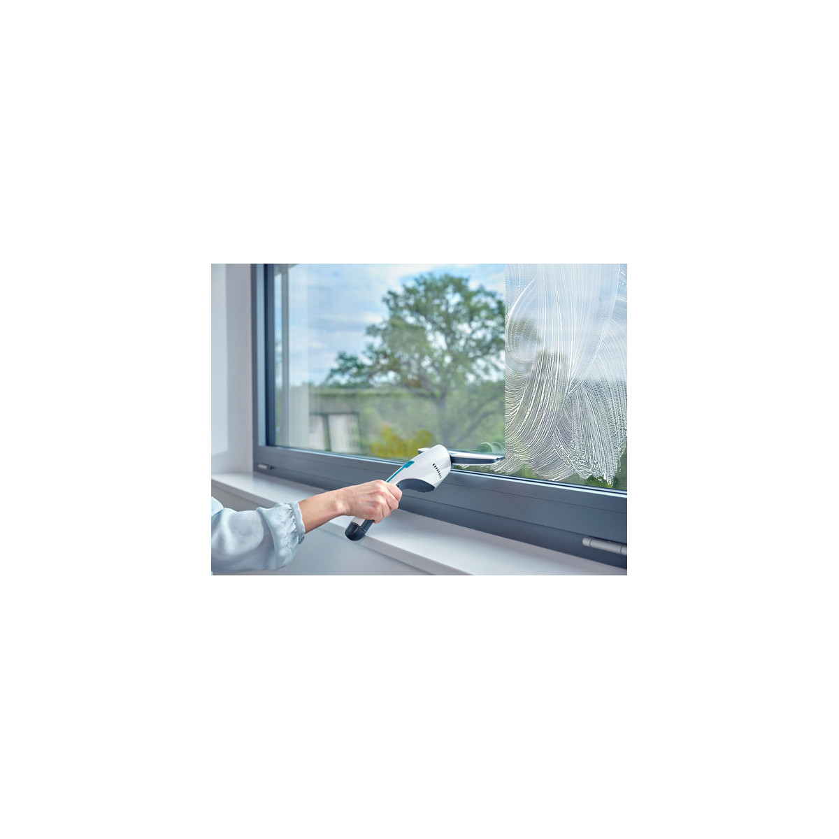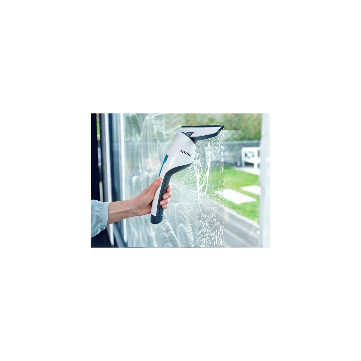 - Particolarmente maneggevole grazie alla forma stretta: il serbatoio integrato nel manico consente la completa aspirazione fino al bordo inferiore della finestra
