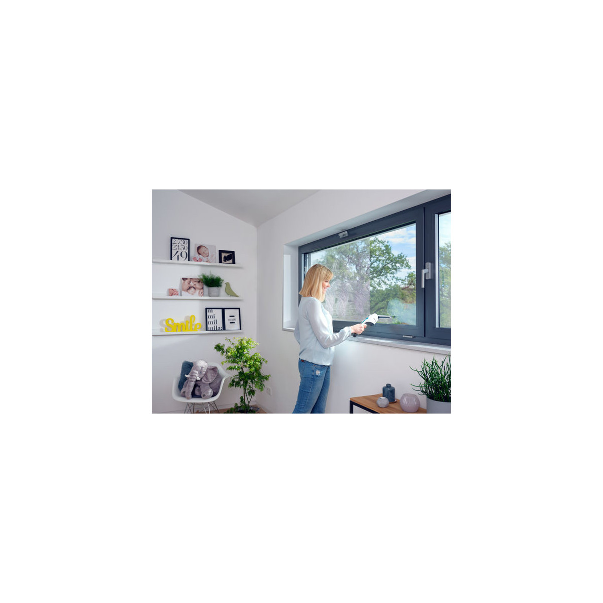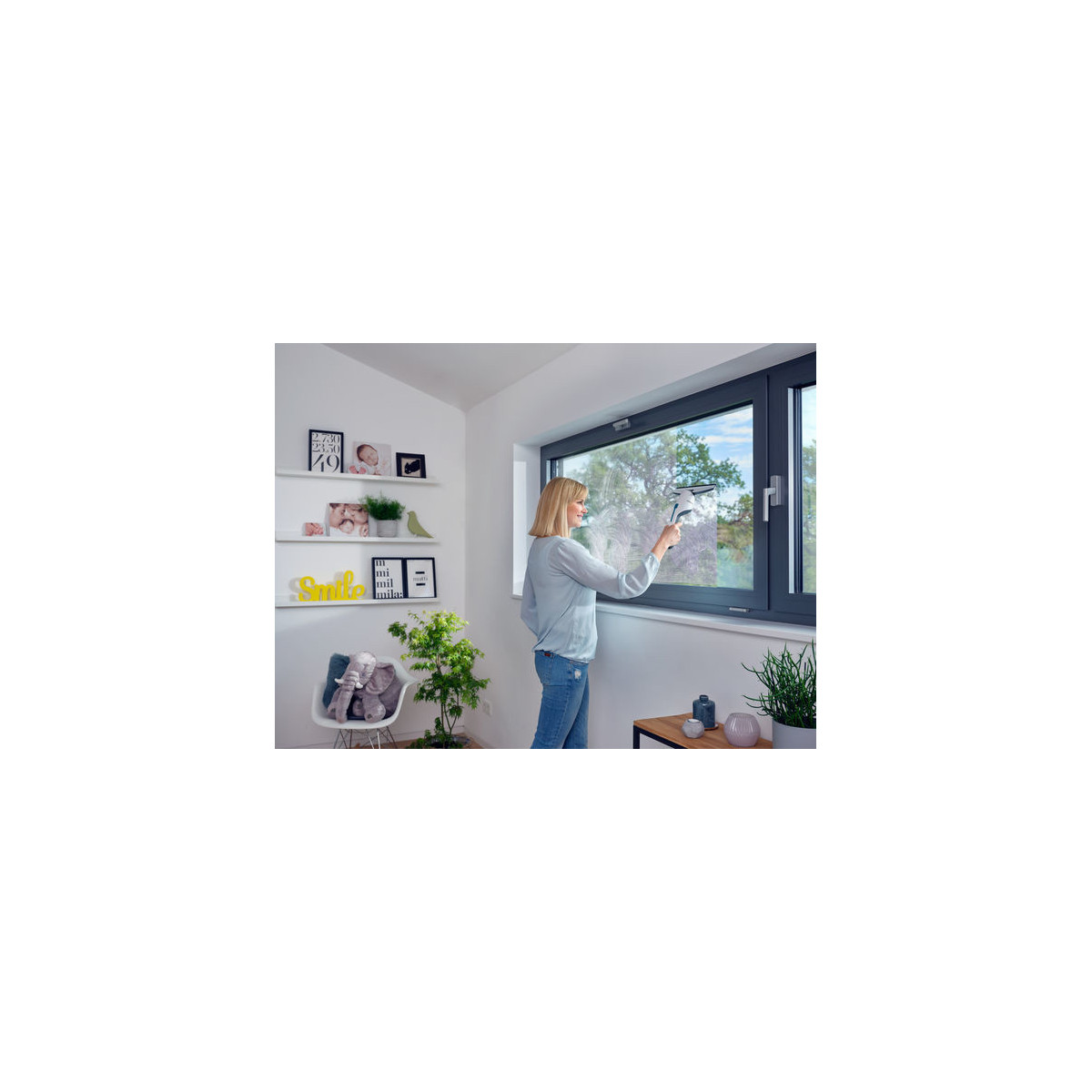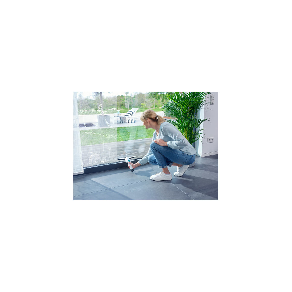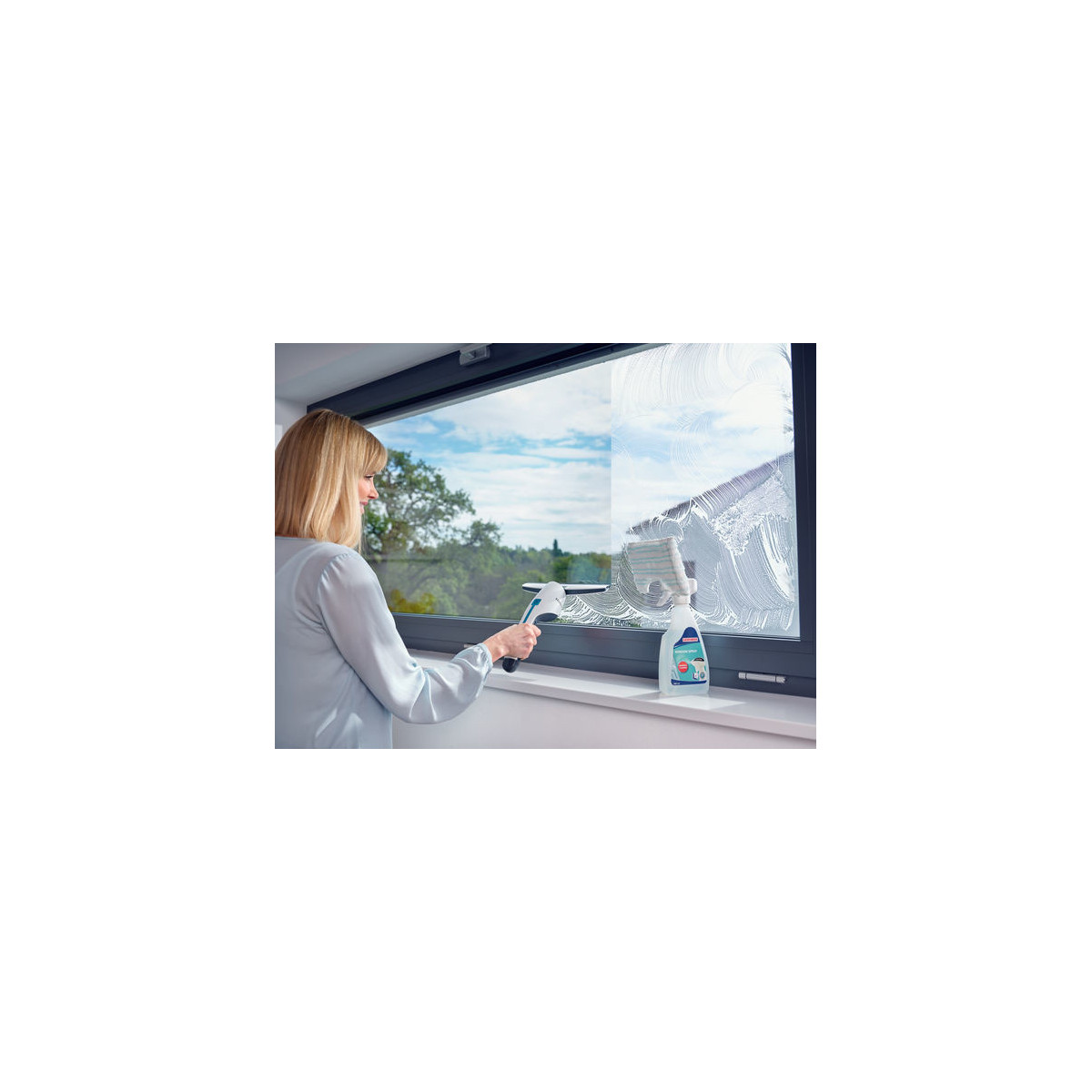 - Particolarmente maneggevole grazie alla forma stretta: il serbatoio integrato nel manico consente la completa aspirazione fino al bordo inferiore della finestra