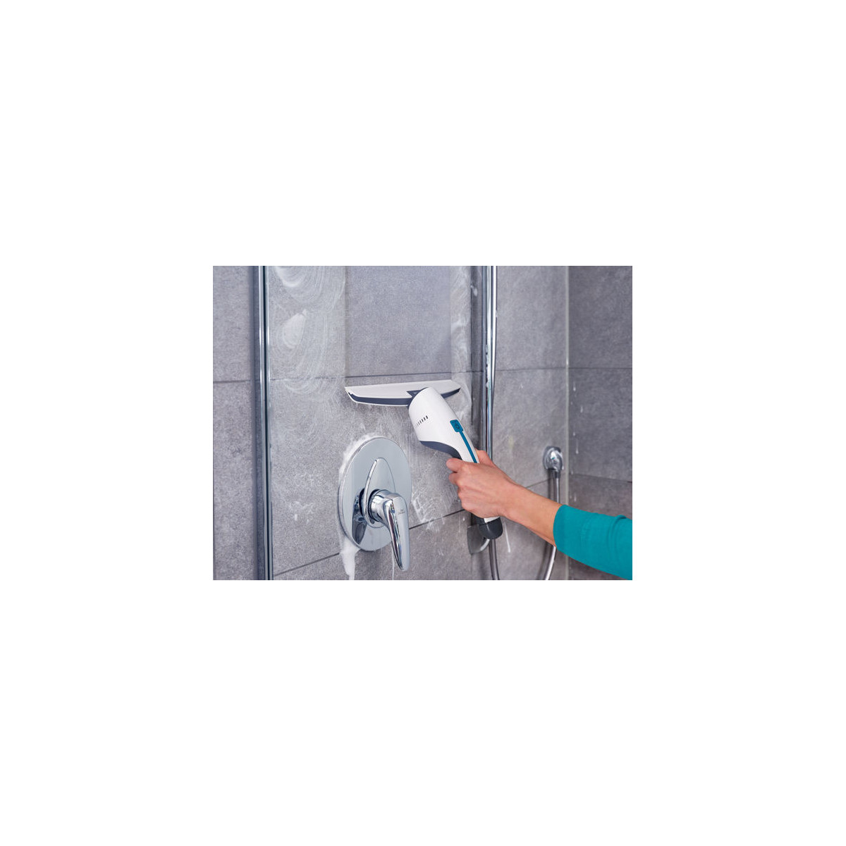 - Bocchetta speciale per la doccia con lamina bianca in gomma per la pulizia igienica di specchi, piastrelle o box doccia disponibile separatamente