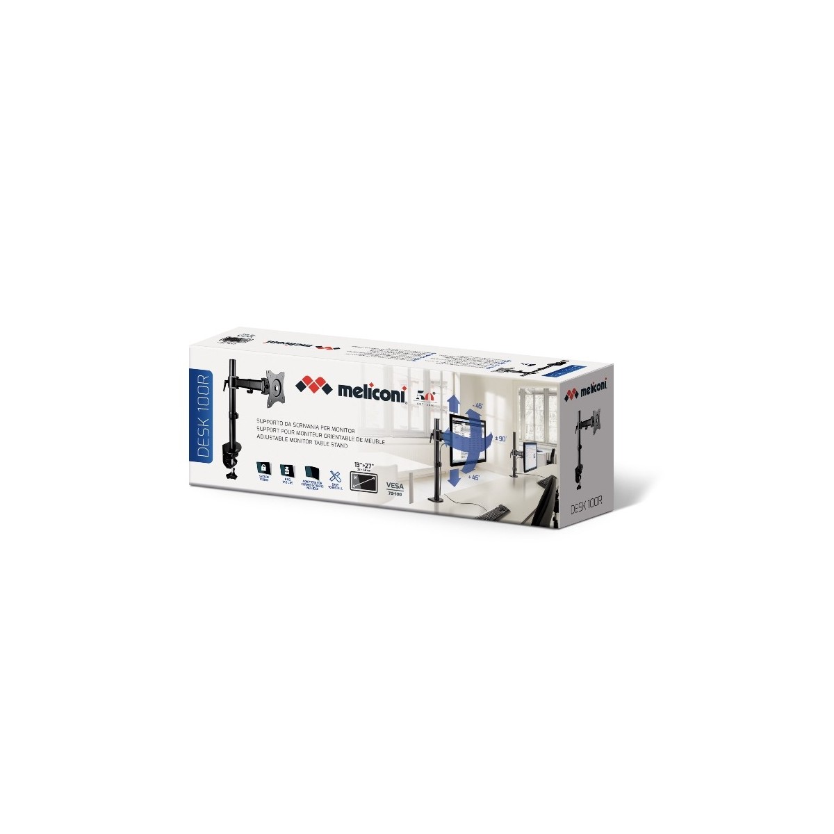 La nuova linea Desk di Meliconi è composta da supporti da scrivania per monitor, che consentono a quest'ultimo di essere regolato in altezza, e orientato verticalmente ed orizzontalmente, l’ideale per garantire una corretta postura del corpo e per posizionare il monitor ad una altezza comoda alla vista. L'installazione del supporto è molto facile e può avvenire utilizzando il foro delle scrivanie già predisposte, oppure avvitandolo al piano della scrivania, o ancora semplicemente utilizzando la morsa di cui è dotata il supporto, senza necessità di fare dei fori!