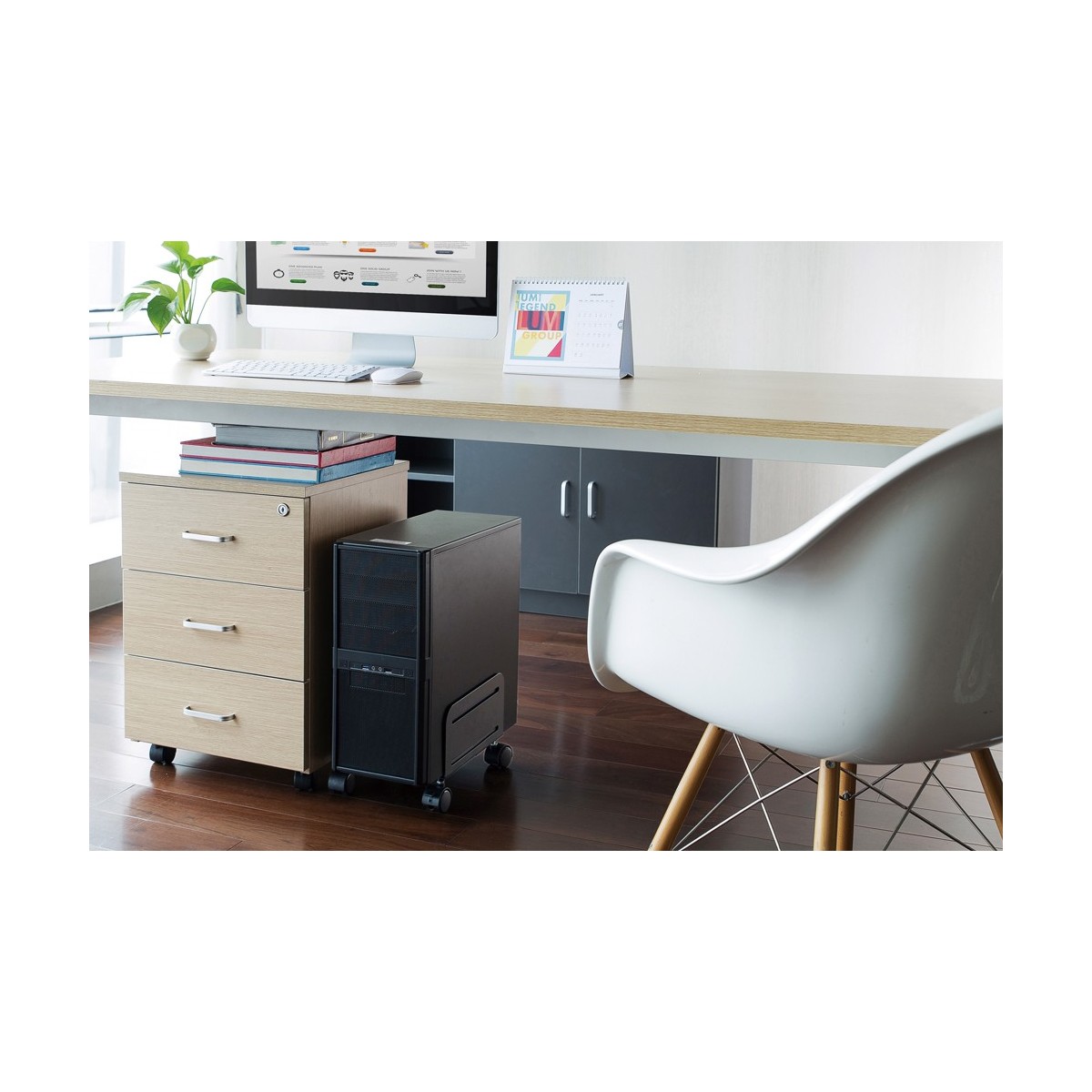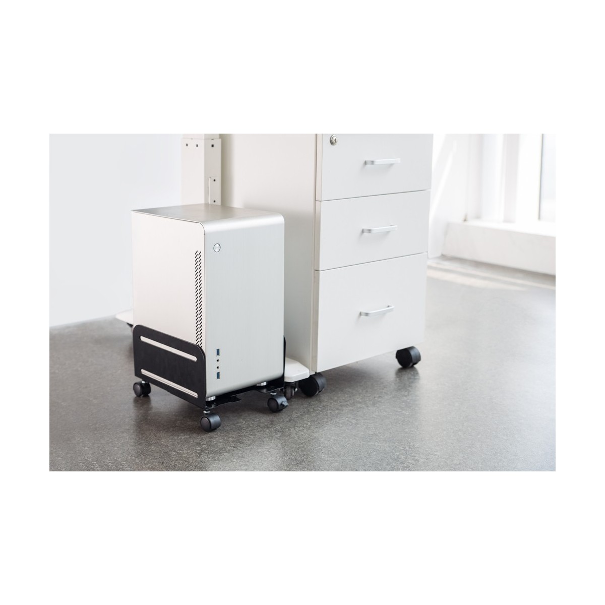 Un supporto per CPU crea una scrivania ordinata e pulita perché è agganciato sotto la scrivania e non occupa spazio sulla scrivania. Aumenta la durata della CPU causata dalla polvere e della sporcizia dei pavimenti. Mantiene pulito il posto di lavoro senza i computer direttamente posizionati sul pavimento o scrivania.