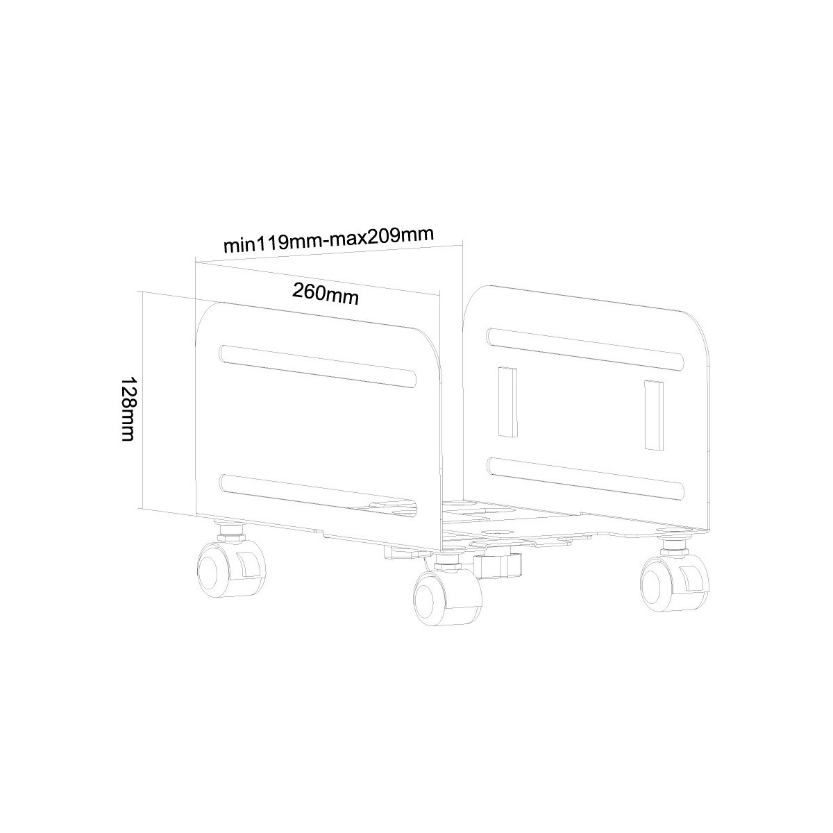 Newstar Supporto che consente di fissare per PC. Tipo: Supporto CPU a carrello, Tipo di chassis raccomandato: Tower, Peso massimo (capacità): 10 kg. Ampiezza del computer supportata (orizzontale) (min): 12 cm, Ampiezza del computer supportata (orizzontale) (max): 21 cm. Larghezza: 210 mm, Profondità: 260 mm. Larghezza scatola principale: 55 cm, Lunghezza del cartone principale: 43 cm, Altezza scatola principale: 33 cm. Peso netto del pacco: 1,53 kg