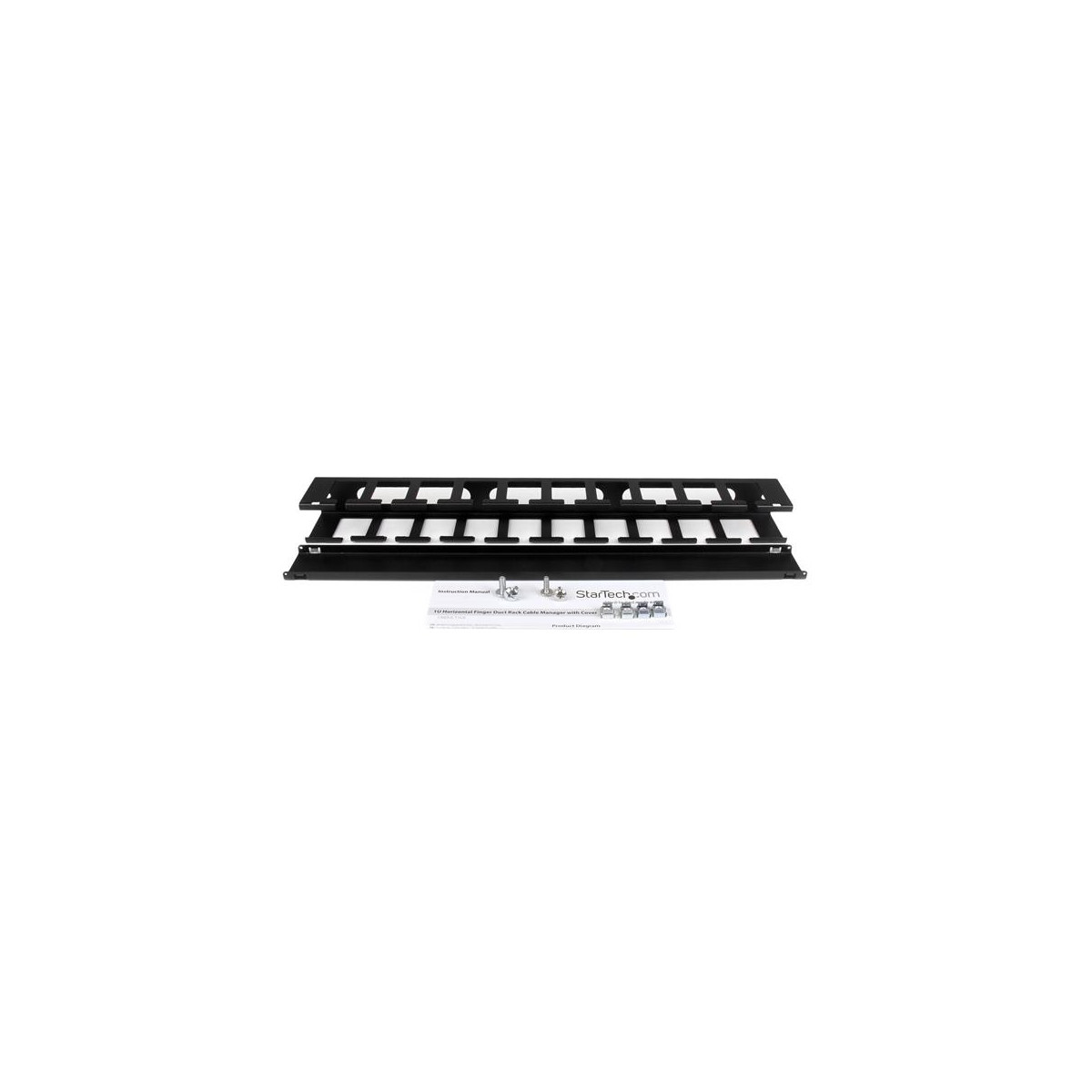StarTech.com Pannello Gestione Cavi Orizzontale per armadi rack 1U con canalina passacavi a denti e copertura. Tipo: Pannello di gestione del cavo, Colore del prodotto: Nero, Materiale della scocca: Acciaio. Larghezza: 482 mm, Profondità: 61,2 mm, Altezza: 47 mm. Larghezza imballo: 87 mm, Profondità imballo: 573 mm, Altezza imballo: 63 mm. Tipo di vite: M5, M6