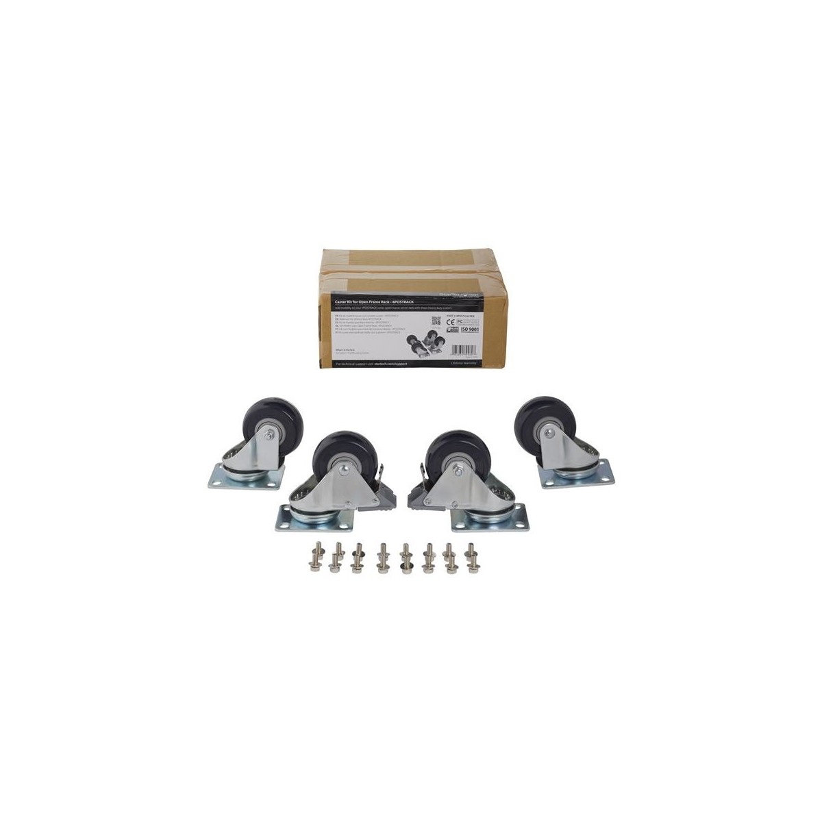 StarTech.com 4POSTCASTER. Tipo: Rotelle, Colore del prodotto: Nero, Acciaio inossidabile, Certificazione: TAA, CE, REACH. Altezza: 87 mm, Peso: 1,6 kg. Quantità per pacco: 4 pezzo(i), Larghezza imballo: 84 mm, Profondità imballo: 95 mm