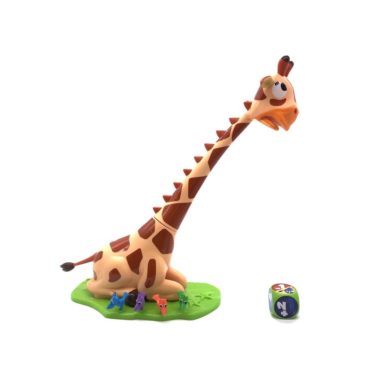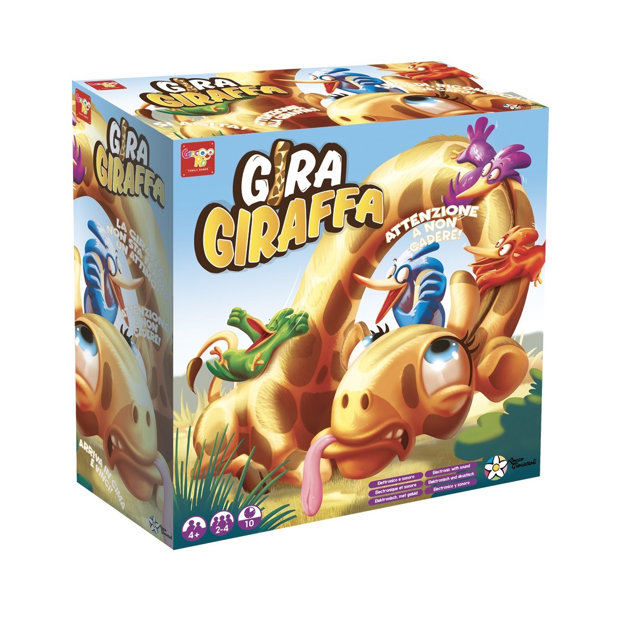Gira Giraffa è il nuovo emozionante gioco Rocco Giocattoli! Tira il dado e segui le azioni indicate: potresti avanzare, retrocedere o essere costretto a tirare la coda alla giraffa. Che disastro. Se le tiri la coda, la giraffa ruoterà il collo e gli uccellini rischieranno di cadere durante la loro scalata. Chi arriverà per primo sulla testa della giraffa sarà il vincitore.