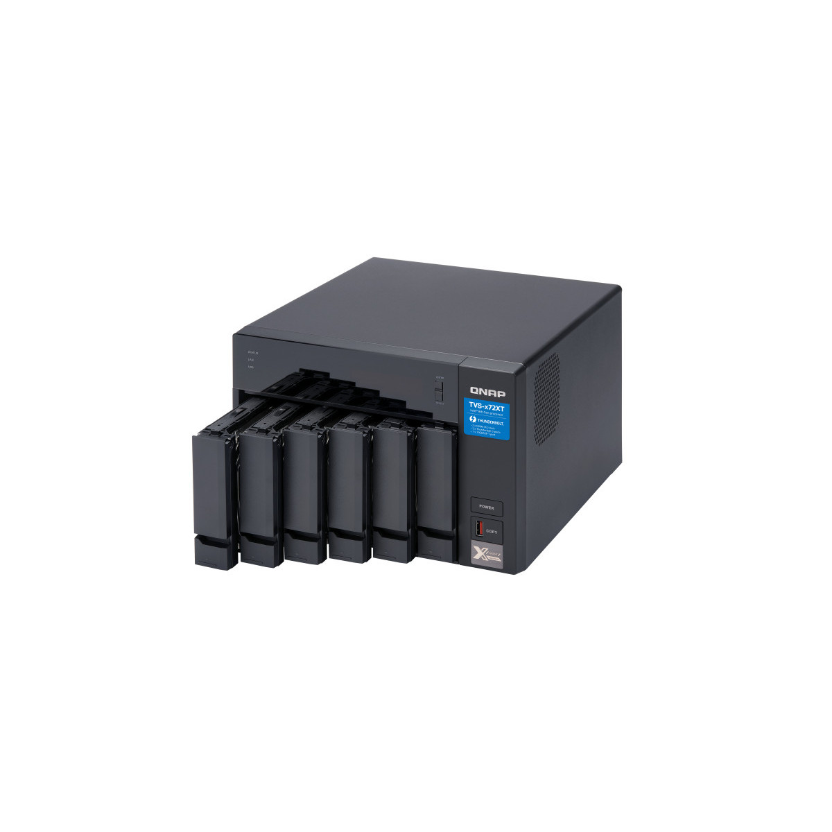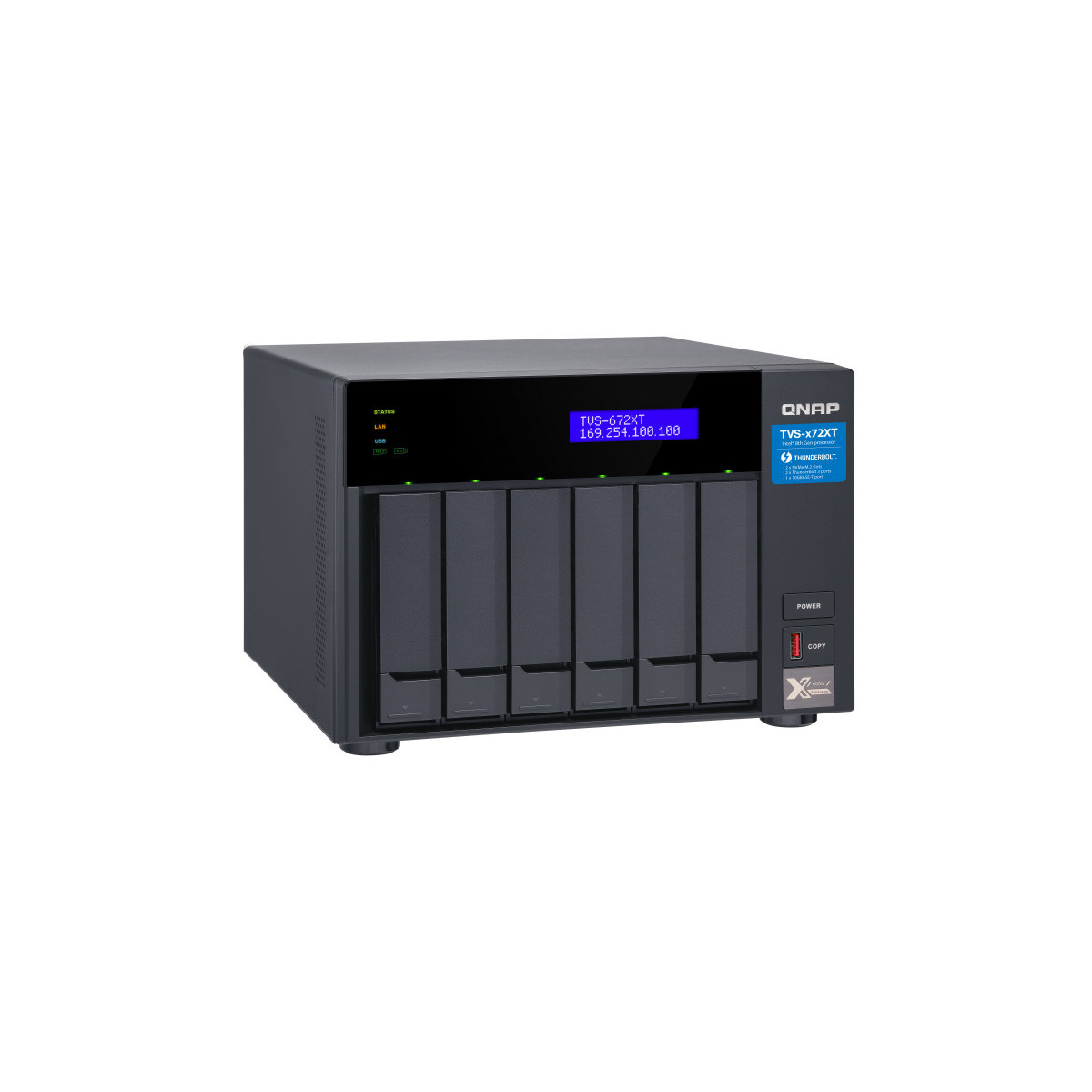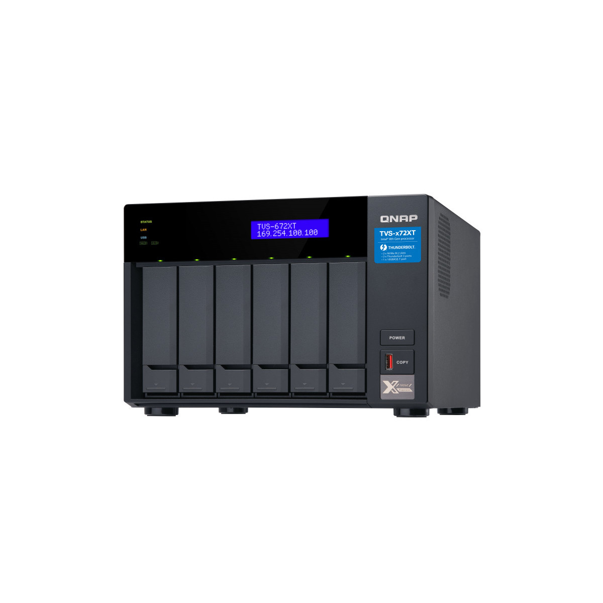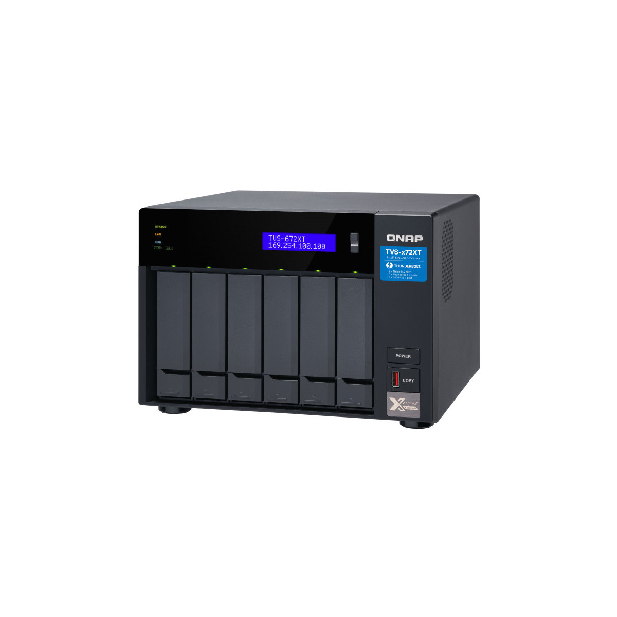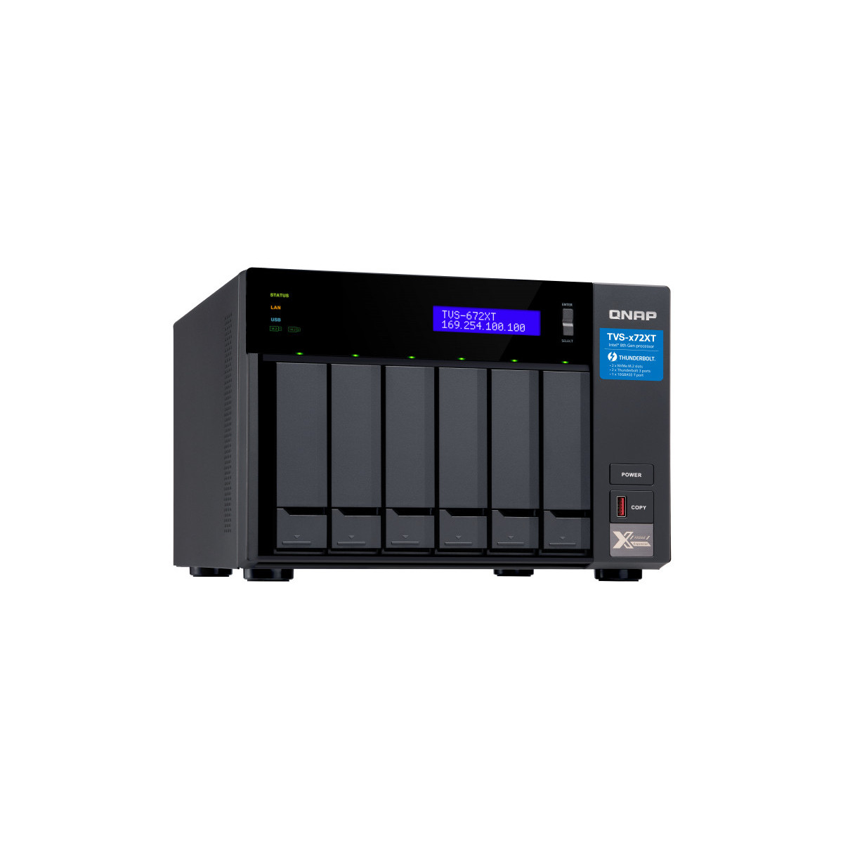 QNAP TVS-672XT - Server NAS - 6 alloggiamenti - SATA 6Gb/s - RAID 0, 1, 5, 6, 10, 50, JBOD - RAM 8 GB - Gigabit Ethernet / 10 Gigabit Ethernet / Thunderbolt 3 - iSCSI