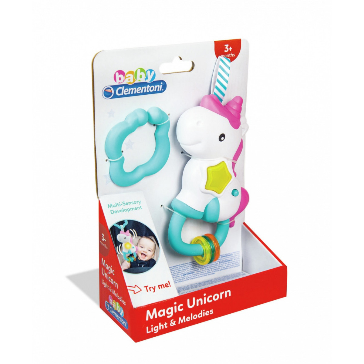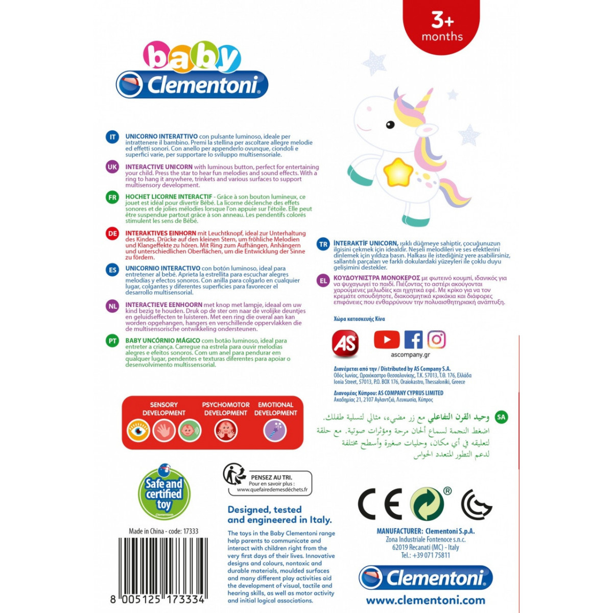Clementoni Unicorno Interattivo. Colore del prodotto: Multicolore, Genere consigliato: Ragazzo/Ragazza, Compatibile con: Culla mobile, Carrozzina/passeggino per bambino. Tipo batteria: LR44. Profondità: 70 mm, Altezza: 220 mm, Lunghezza: 15 cm. Quantità per pacco: 1 pezzo(i), Tipo di imballo: Scatola aperta