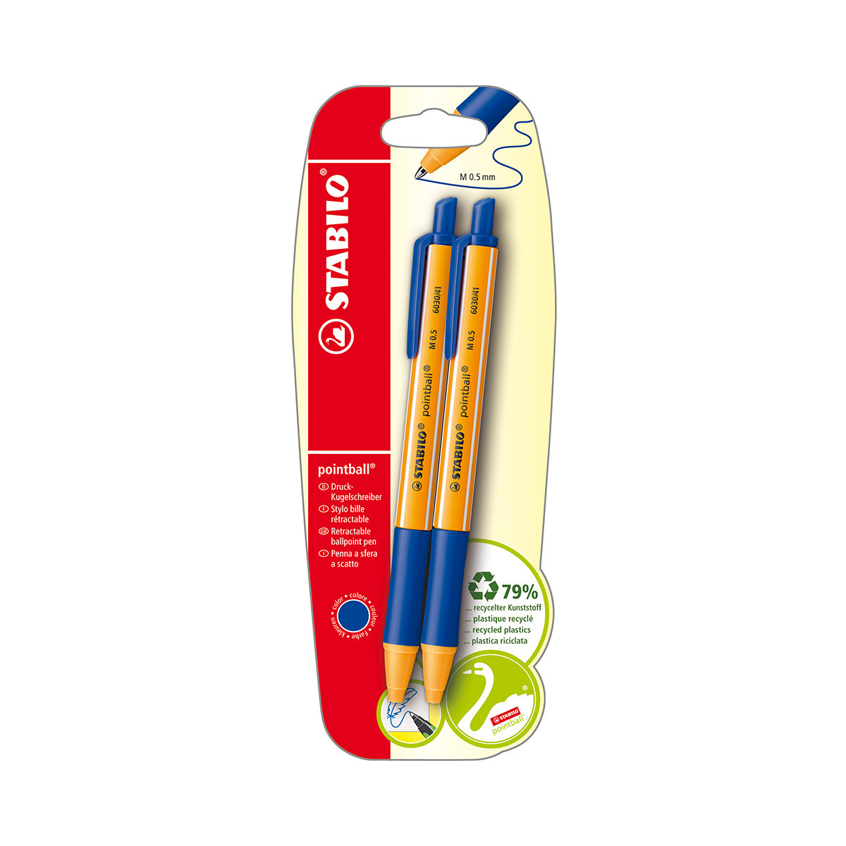 STABILO 2 Penne a Sfera a Scatto pointball Blu. Colore del prodotto: Blu, Giallo, Colore penna: Blu, Tipo: Penna a sfera retrattile a clip. Quantità per pacco: 2 pezzo(i), Tipo di imballo: Blister
