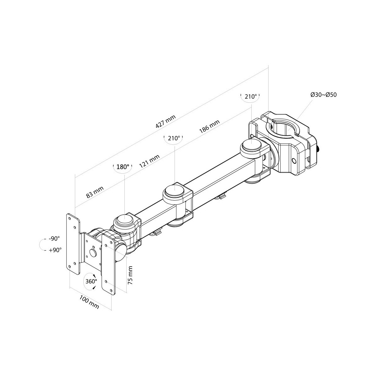 Utilizzate un palo di sostegno per sfruttare pienamente le capacità del vostro schermo. Il braccio è facile da regolare. È inoltre possibile inclinare lo schermo in senso verticale, orizzontale e farlo ruotare. Questo crea l'angolo di visione ideale riducendo il rischio di mal di schiena e al collo. Questo supporto è adatto per diametri da 30 a 50 mm.